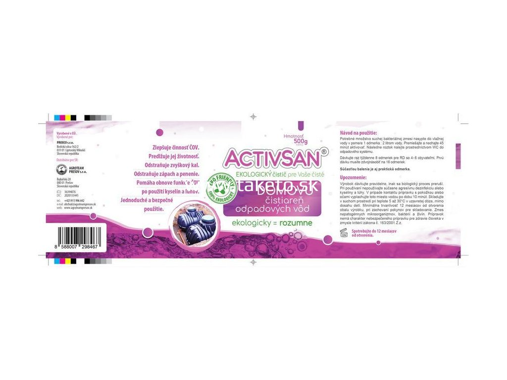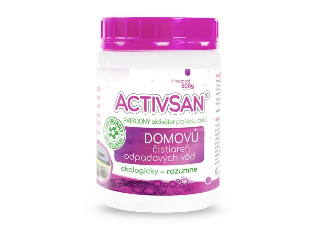 Activsan ČOV 500g je prípravok určený k rozkladu zvyškových organických nečistôt v domovej čistiarni odpadových vôd. Optimalizuje chod domovej čističky odpadových vôd tým, že odstraňuje zvyškový kal a usadeniny, a tak zaisťuje bezporuchový chod čistiarne odpadových vôd, predchádza upchávaniu potrubia a zamedzuje tvorbe nepríjemného zápachu. Po jeho použití dochádza k rozkladu organických zvyškov v domovej čističke odpadových vôd na tekutinu bez zápachu. Výrobok je dôležitý tam, kde má domáca čistička odpadových vôd preplnenú kapacitu prísunu odpadových vôd z domu.