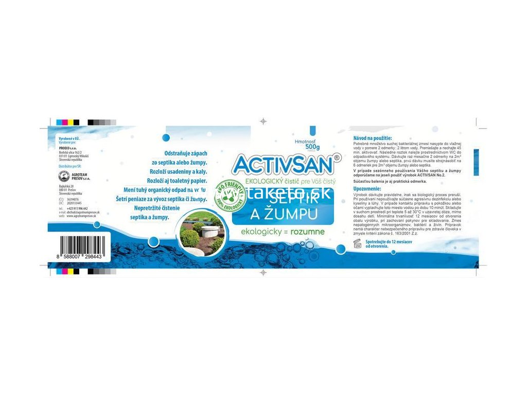 Activsan Septik a žumpa 500g je prípravok určený pre rozklad organických nečistôt, usadenín a kalov v žumpách a septikoch. Pôsobením baktérií a nimi tvorených enzýmov dochádza ku skvapalneniu pevného organického odpadu, ktorý sa zmení v nezapáchajúcu kvapalinu. Kvapalinu možno neskôr bez problémov čerpať, nedochádza k upchávaniu kanalizácie ani prípadných trativodov. Pravidelným používaním tak odpadá časté a nákladné vyváženie a čistenie septiku alebo žumpy, pretože predtým sa tvoriace kaly a usadeniny znižovali využiteľný obsah žumpy alebo septiku a vývoz teda musel byť oveľa častejší. Všetok organický odpad sa rozkladá najmä na vodu a CO2.