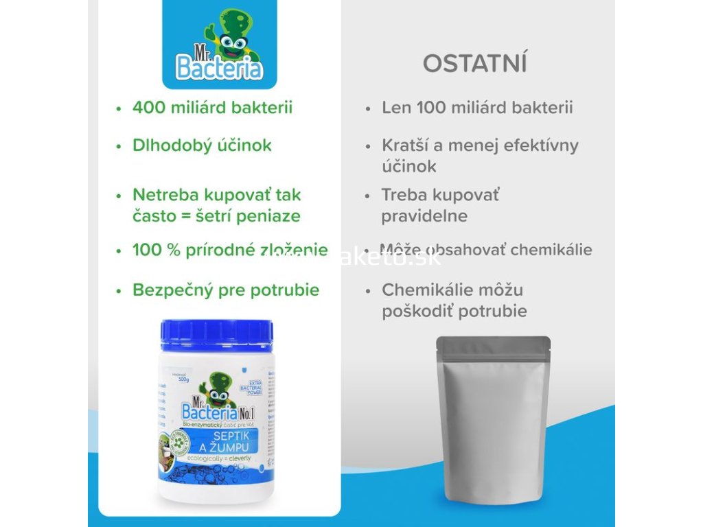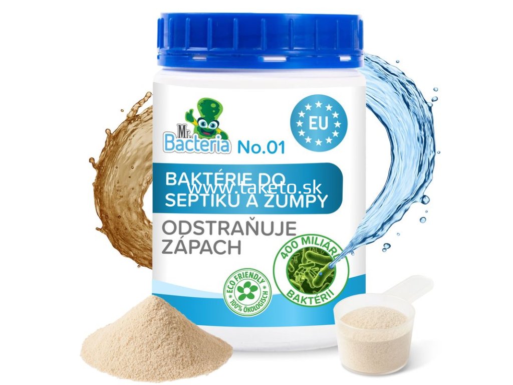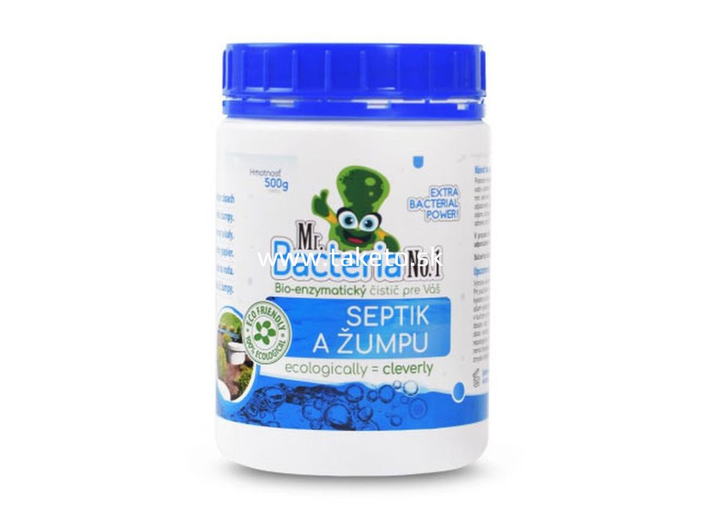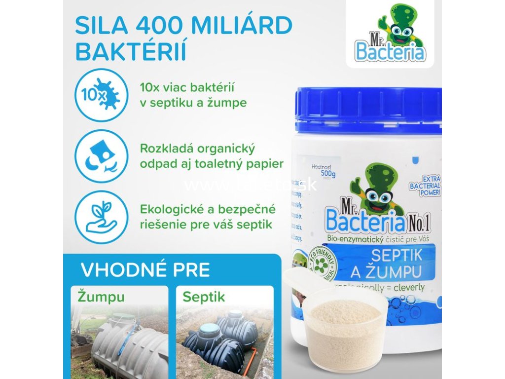 Bio-enzymatický čistič Mr. Bacteria No.1 je vysoko účinný prípravok na udržiavanie čistoty septikov a žúmp. Obsahuje 400 miliárd baktérií v 0,5 kg balení, ktoré pomáhajú rozkladať organický odpad a eliminovať nepríjemný zápach.