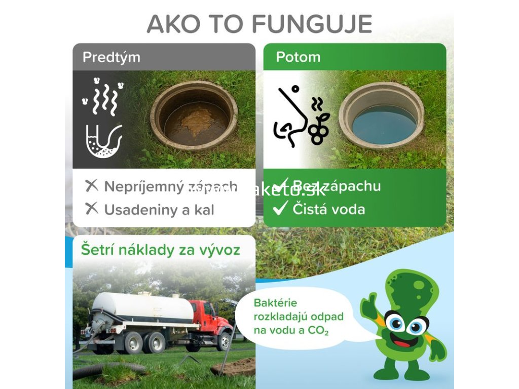 - Odstraňuje zápach zo septiku alebo žumpy
