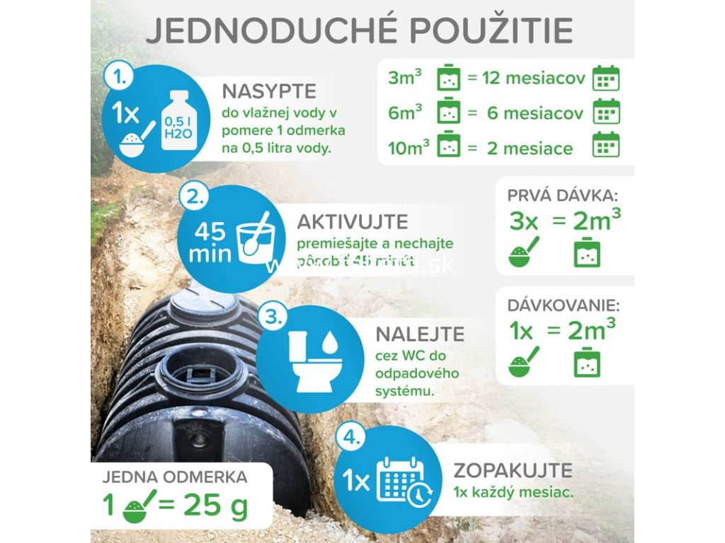 - Jednoduchá aplikácia priamo do septiku alebo žumpy