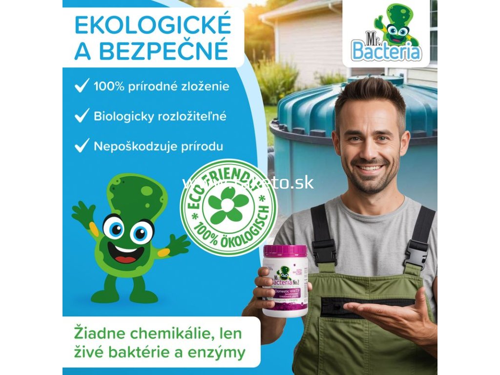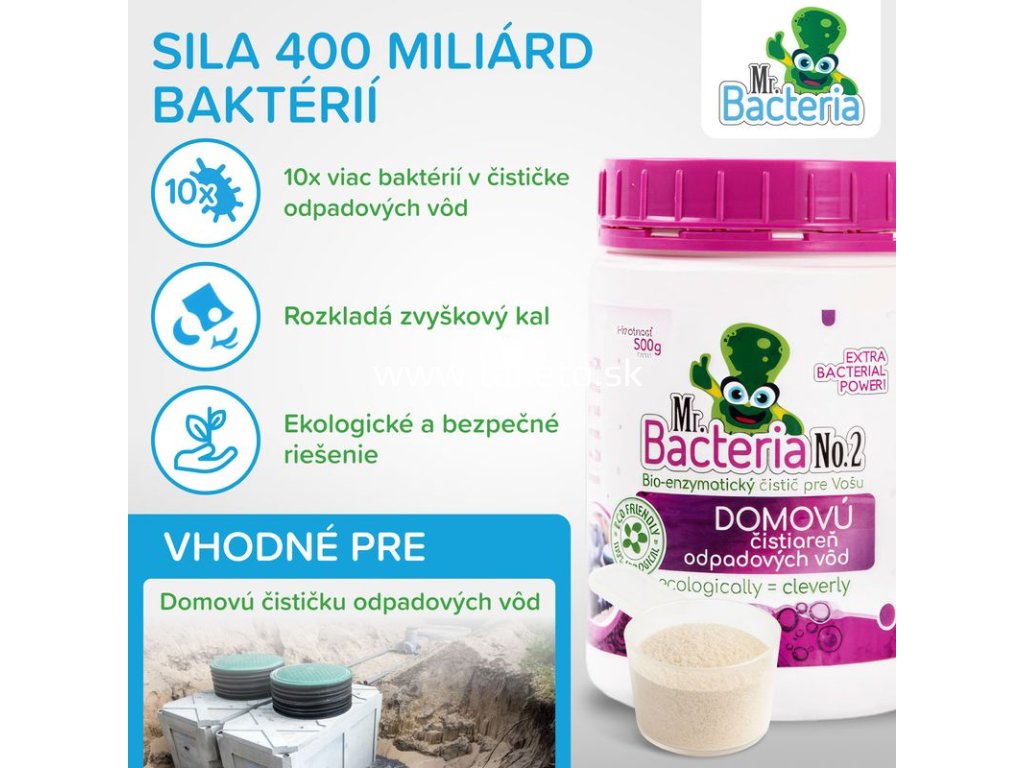 Bio-enzymatický aktivátor Mr. Bacteria No.2 je špeciálne vyvinutý na optimalizáciu výkonu domových čističiek odpadových vôd (ČOV). Pomáha rozkladať kal, zlepšuje funkčnosť systému a predlžuje jeho životnosť.