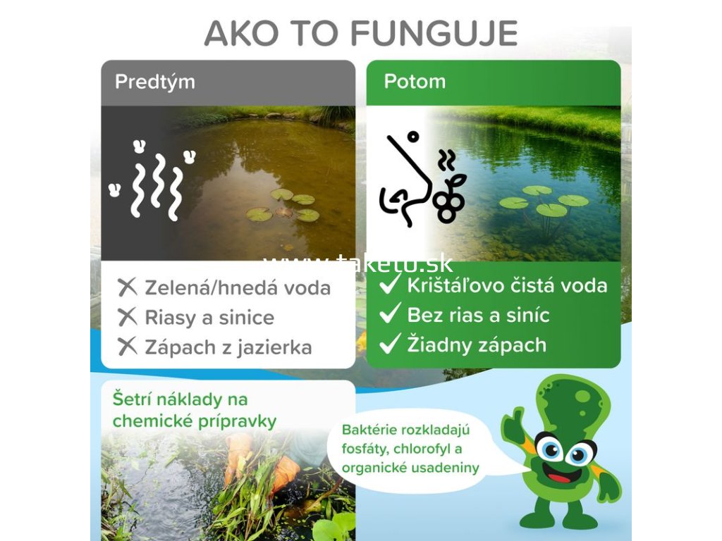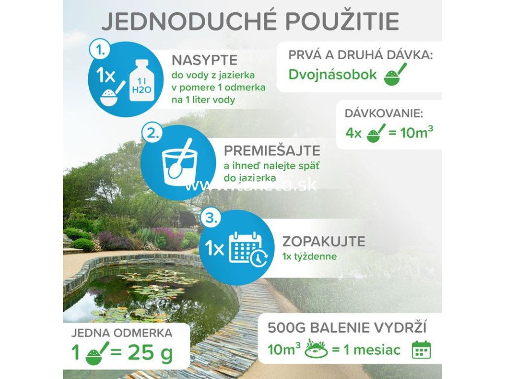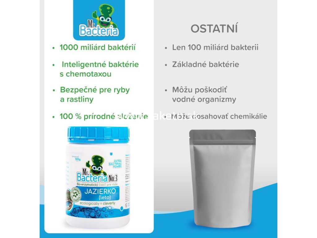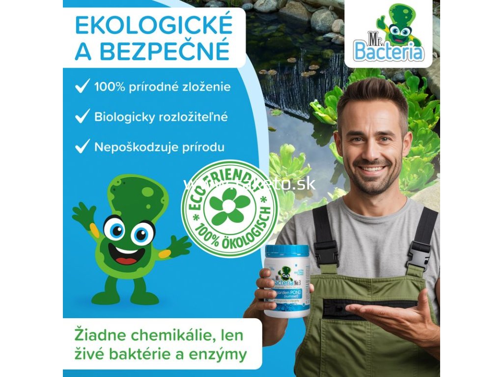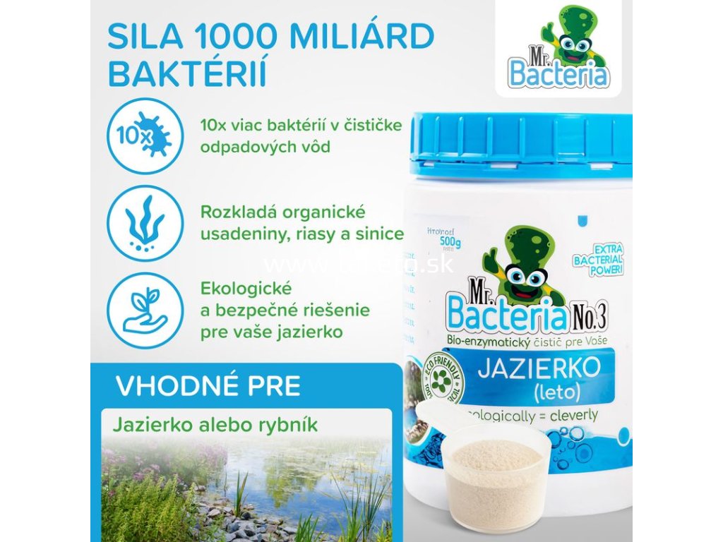Mr.Bacteria No.3 je špeciálny biologický aktivátor určený na udržiavanie čistoty a ekologickej rovnováhy v záhradných jazierkach a rybníčkoch. Obsahuje prírodné baktérie, ktoré aktívne vyhľadávajú a rozkladajú organické nečistoty vo vode aj na dne jazierka. Prípravok efektívne odstraňuje kal a zákal vo vode, rozkladá organické usadeniny, čím eliminuje hnedú a zakalenú vodu. Redukuje riasy a sinice tým, že baktérie rozkladajú živiny podporujúce ich rast, a zároveň znižuje fosfáty a chlorofyl A, čím prispieva k dlhodobo čistej vode a udržuje ekologickú rovnováhu jazierka.