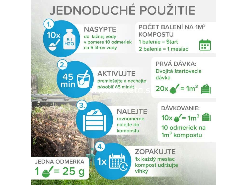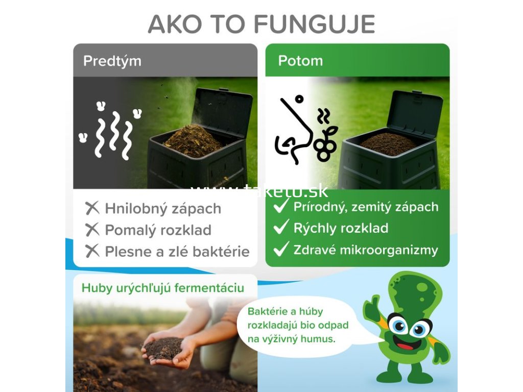 - Urýchľuje zrenie kompostu až o 3 mesiace.