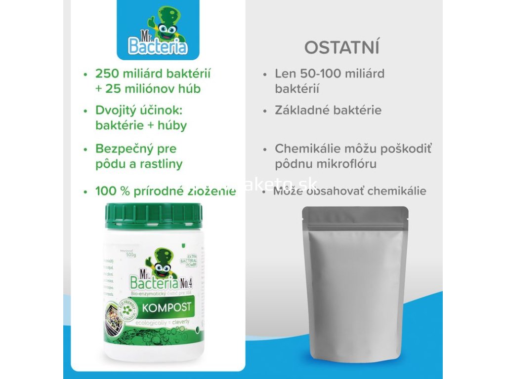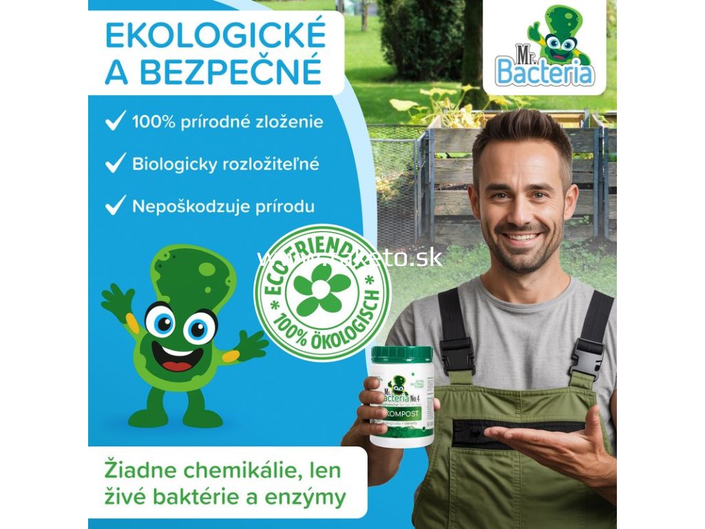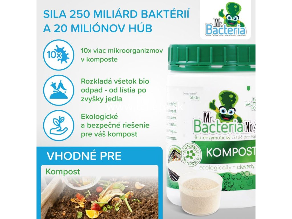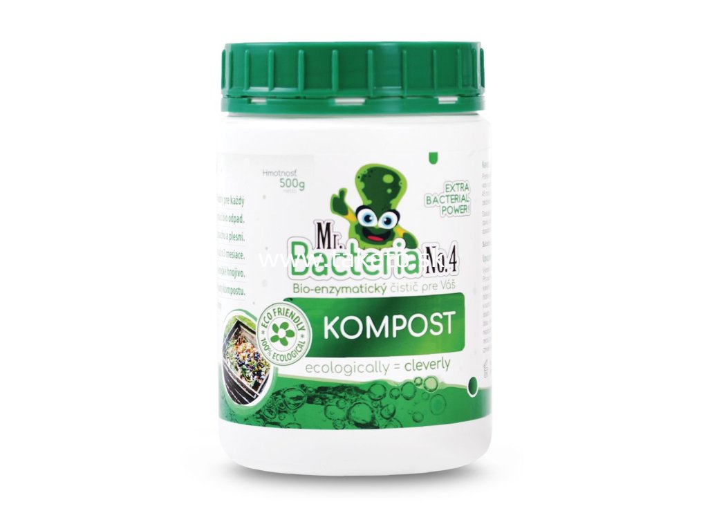 Úplne prírodný a ekologický bio-aktívny prípravok Mr. Bacteria No. 4 urýchľovač kompostu je určený na urýchlenie kompostovania. Obvyklá dĺžka kompostovanie je v rozsahu jedného roka. Prípravok Mr. Bacteria No. 4 vie značne urýchliť proces kompostovania záhradného odpadu a vybraného biologického odpadu z Vašej domácnosti. Mr. Bacteria No. 4 je zmes bakteriálnych kultúr zmiešaných s nespracovanými enzýmami, emulgátormi a živinami, špeciálne navrhnutá pre kompostovanie organických odpadov (odpad po sezónnom prerezávaní okrasných kríkov - štiepka, kôra, piliny, tráva, lístie, ovocie, zelenina, kvety, bioodpad z domácností a pod.). Výrobok funguje v dvoch fázach: urýchlenie naštartovania a výrazné skrátenie celého procesu kompostovania. Použitím prípravku Mr. Bacteria No. 4 dochádza k maximalizácii hnojív hodnôt kompostu. Výsledkom použitia prípravku Mr. Bacteria No. 4. je skrátenie dĺžky kompostovania.