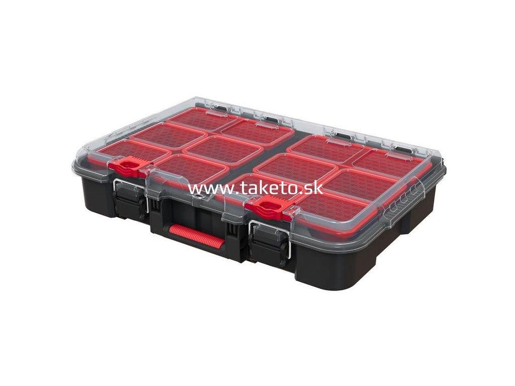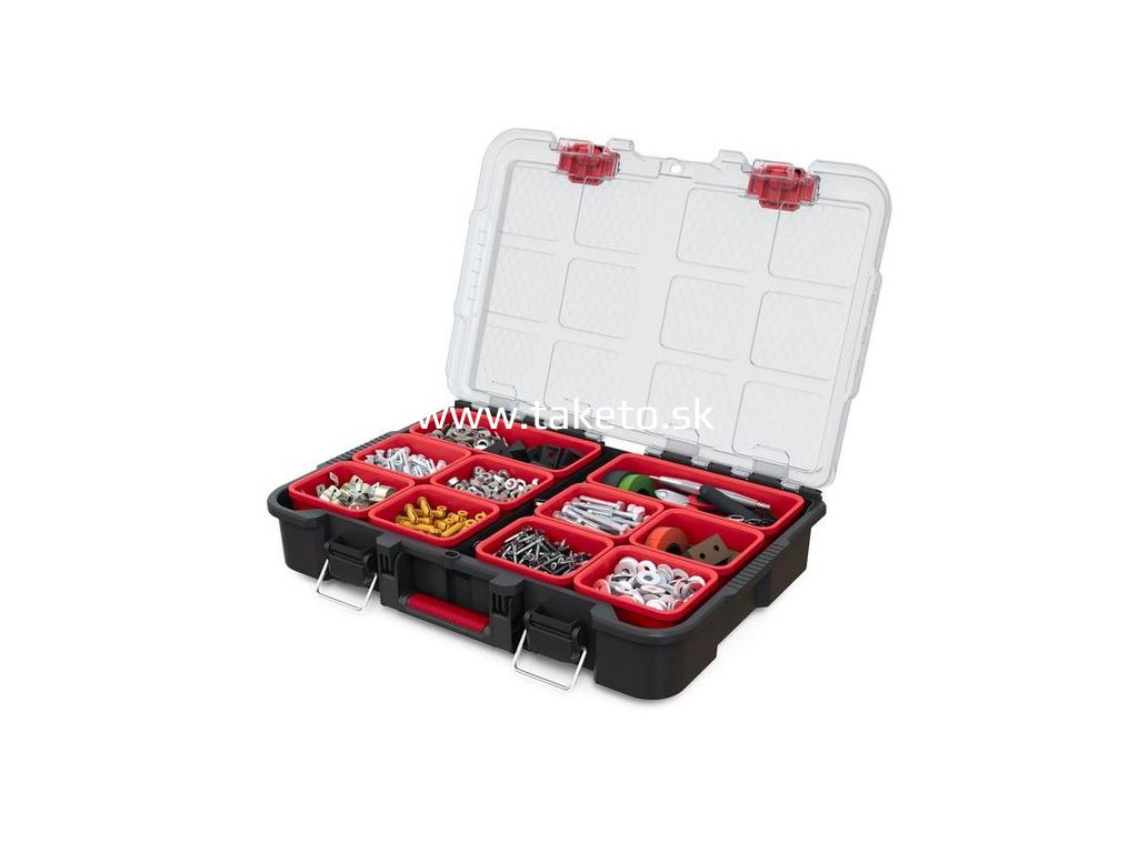 - organizérje vybavený rukoväťou z mäkkej gumy, prepínacími kovovými západkami, bočnými úchopmi, odnímateľnými priehradkami organizéra rôznych veľkostí pre vlastnú konfiguráciu, očkom na visiaci zámok, priehľadným vekom organizéra s antimigračnou štruktúrou pre viditeľnosť obsahu (kapacita 10 kg); 51,5 x 34,5 x 11,5 cm (DxŠxV)