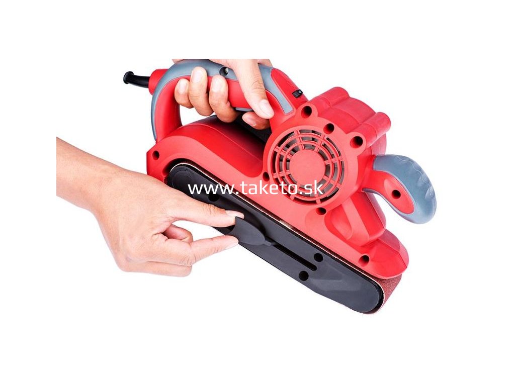 Hlavnú úlohu pri brúsení zohráva okrem motora, brúsiaci pás. Jeho rozmery sú 76 x 533 mm. Pás jednoducho priložíte na potrebný materiál a brúsite. Po opotrebovaní brúsneho papiera je potreba vymeniť ho za vhodný typ. Vďaka jednoduchému mechanizmu nebudete mať problém s rýchlou výmenou brúsneho pásu. Oceníte tiež praktický gombík, ktorý slúži na vycentrovanie brúsneho pásu.