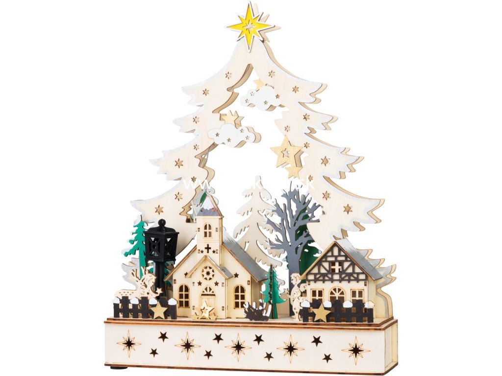 Dekorácia MagicHome Vianoce, dedinka, drevo, 12xLED teplá biela, 25x7.5x32 cm, 2xAA + praktický pomocník k objednávke