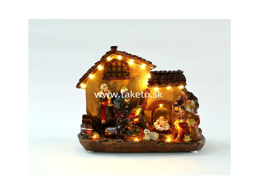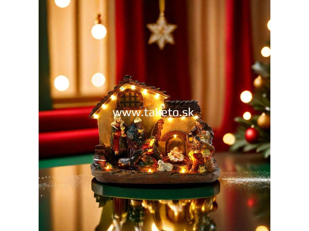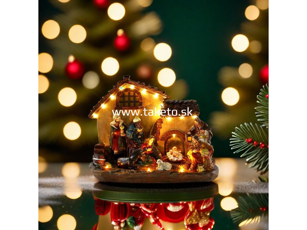 Domček je osvetlený 16 LED diódami, ktoré rovnomerne rozžiaria celý betlehem a zvýraznia jeho detaily. S rozmermi 29 × 14 × 24 cm sa stane výrazným prvkom vianočnej výzdoby – ideálnym na stôl, poličku alebo pod vianočný stromček.