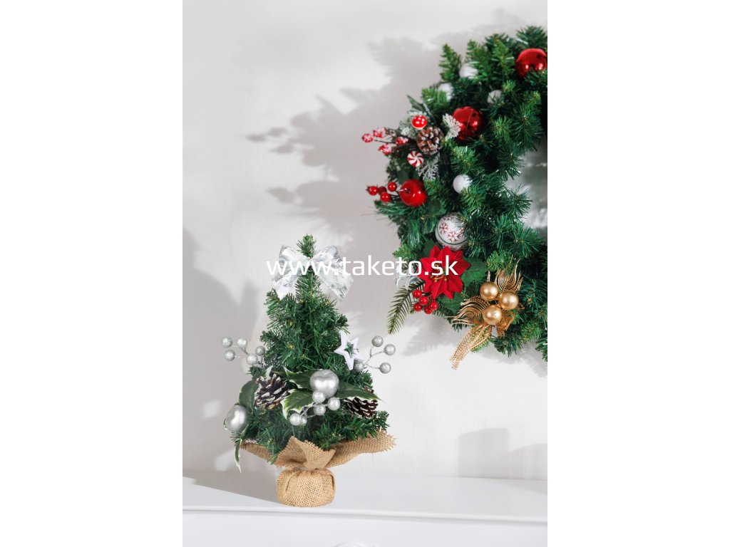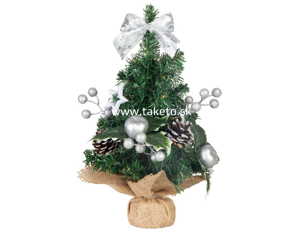 Dekorácia MagicHome Vianoce, stromček, 30 cm je štýlovým doplnkom, ktorý navodí sviatočnú atmosféru v každom interiéri. Malý vianočný stromček je zdobený striebornými ozdobami, šiškami a elegantnou mašľou, vďaka čomu pôsobí prirodzene a zároveň slávnostne. Jeho kompaktná veľkosť ho predurčuje na umiestnenie na stôl, policu alebo do okna, kde sa stane neprehliadnuteľným prvkom vašej výzdoby. Vďaka stabilnému podstavcu v jutovej úprave je stromček nielen praktický, ale aj estetický.