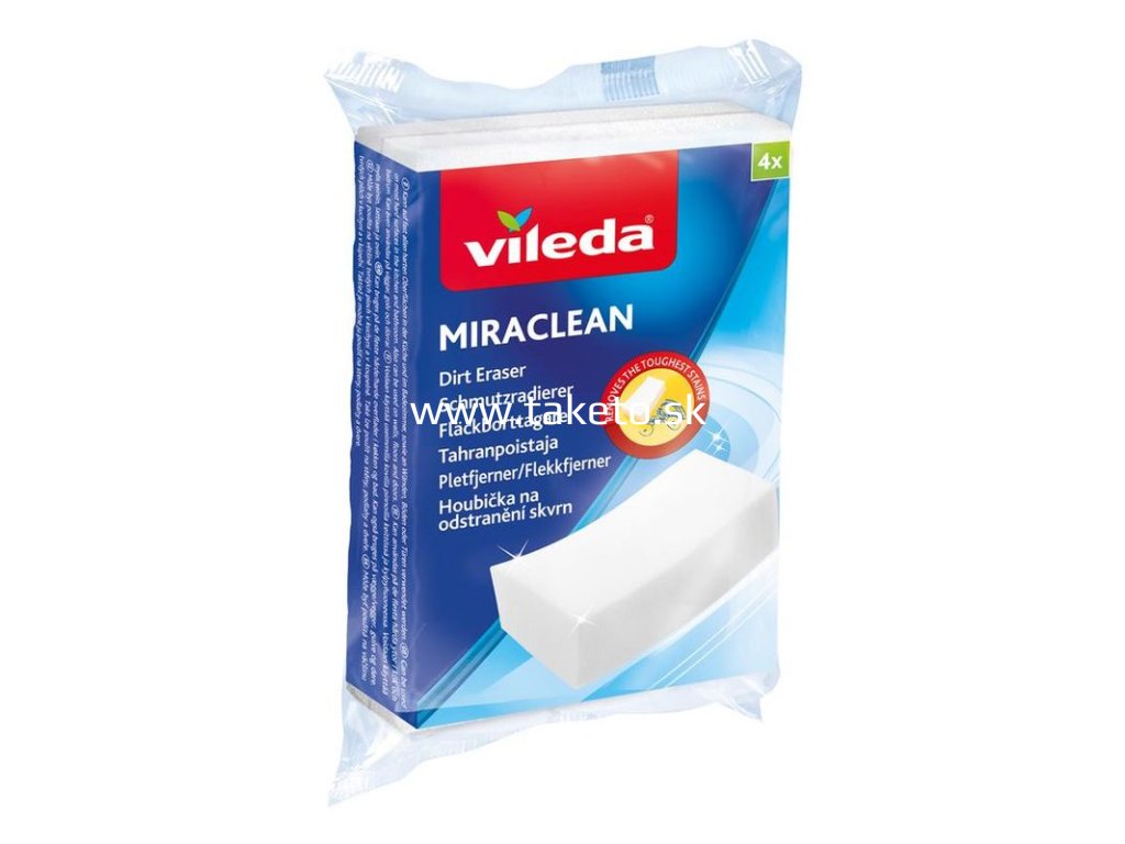 Hubka Vileda Miracleanľahko odstraňuje škvrny(čaj, káva, vodný kameň, škrvny pera apod.) z väčšiny tvrdých povrchov. Môže byť použitá naväčšine tvrdých plôchv kuchyni a kúpeľni. Je možné ju použiť aj nasteny. Pred použitím je potrebné hubku jemne navlhčiť.