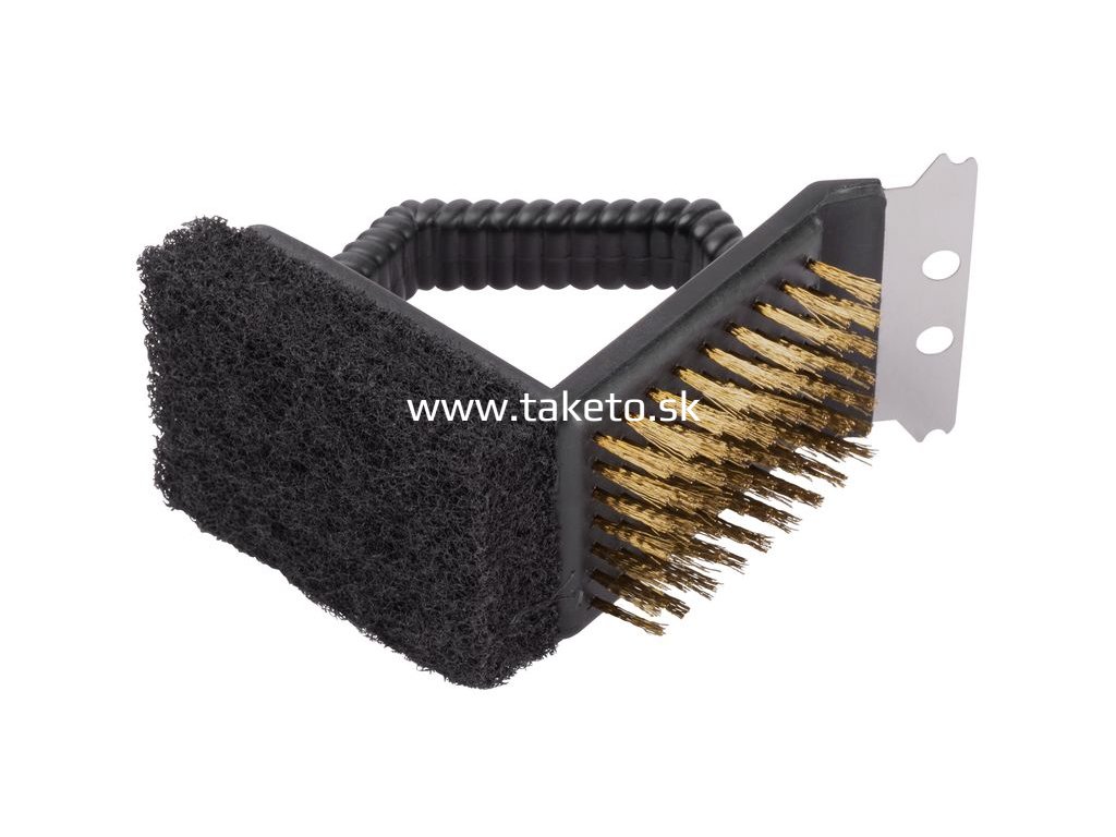 Malá ručná kefa je praktickým prostriedkom pre odstránenie nečistôt z grilu. Má trojuholníkový tvar, pričom každá strana slúži pre iné účely. Jedna strana rúčky slúži na uchopenie kefy. Pre odstránenie najhrubšej špiny sa odporúča použiť kovovú škrabku. Následne pre dodatočné odstránenie jemnejšej špiny a nečistôt použite druhú stranu trojuholníkovej kefy s mosadznými štetami. Mosadzné štetiny sú šetrné k povrchu grilovacieho roštu. Po očistení grilu od všetkých nečistôt použite tretiu stranu, na ktorej sa nachádza hubka. Pomocou hubky je možné kvalitne vyleštiť povrch čisteného grilovacieho roštu, čím zabezpečíte maximálnu čistotu.