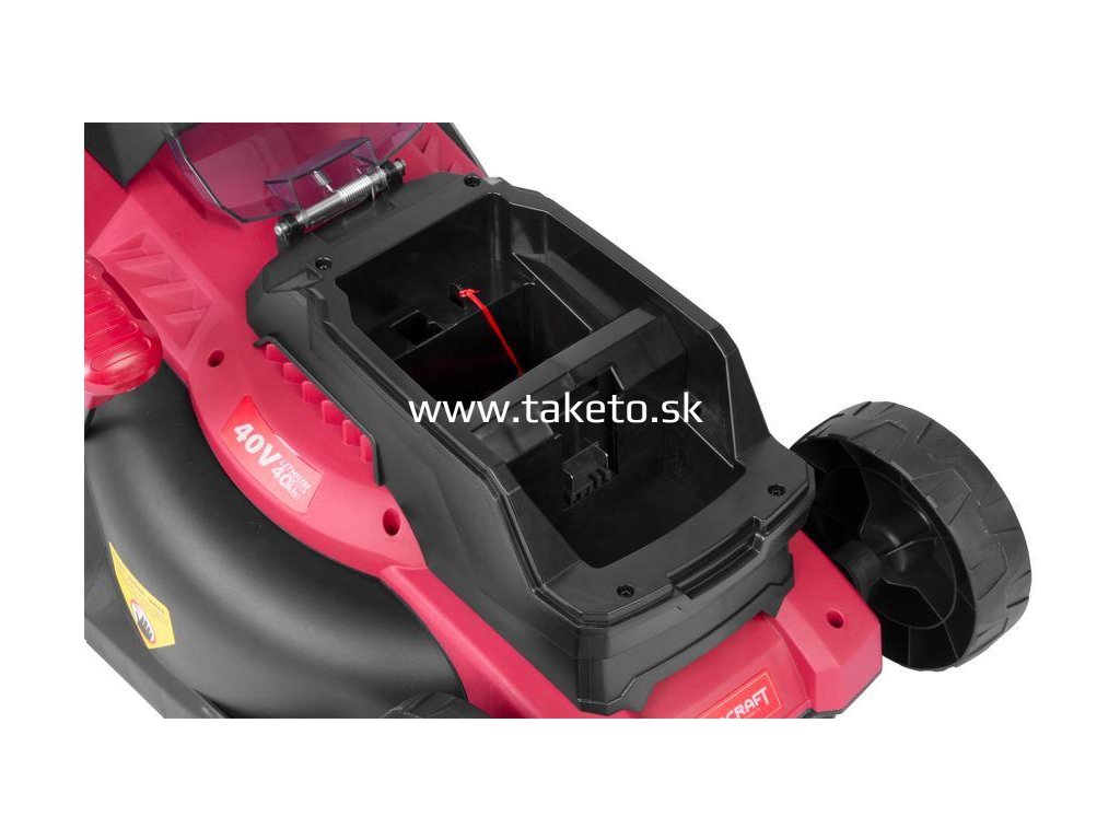 Kosačka Worcraft CLM-S40Li je akumulátorová kosačka, ktorá kombinuje výhody elektrických kosačiek. Zdrojom energie sú dva kvalitné Li-ion akumulátory. Kosačka pracuje rýchlosťou až 2600 otáčok/ min. Šírka záberu pri kosení dosahuje 34 cm a rezná výška je 25 až 75 mm/ 6 stupňov. Akumulátorová kosačka disponuje zberným košom s objemom 35 litrov. Pokosená plocha na jedno nabitie akumulátora predstavuje až 250 m2. Balenie obsahuje 2x akumulátor 4.0 Ah a nabíjačku.