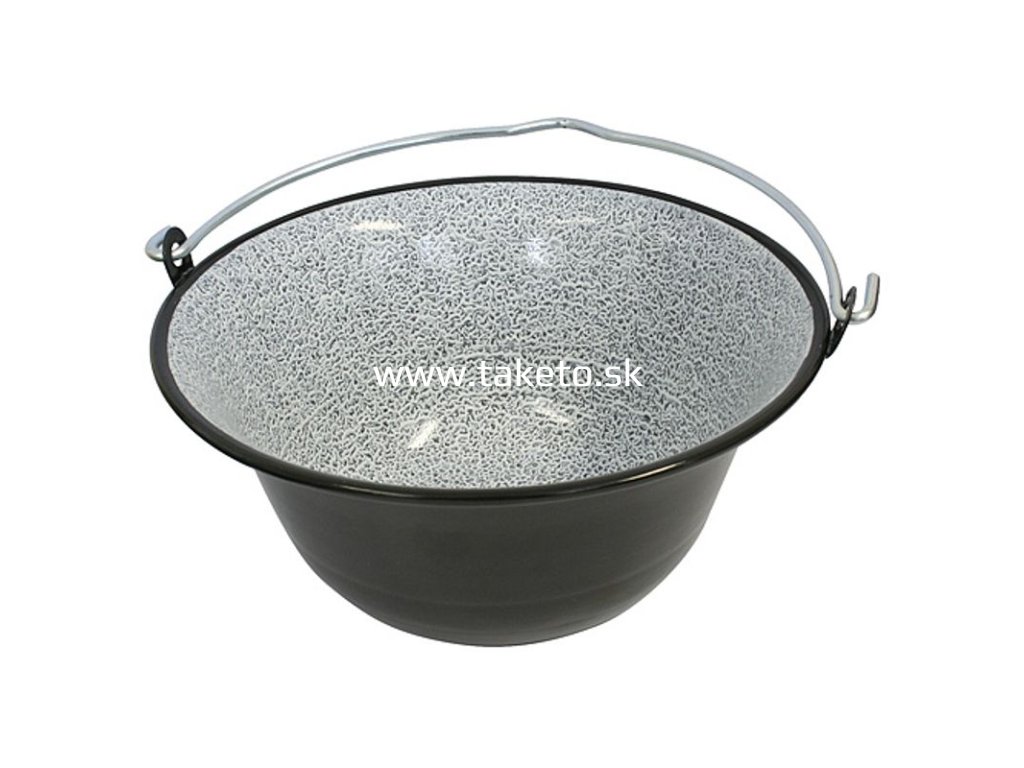 Kovový kotlík 6 lit, smaltovaný na guľáš s pozinkovaným kovovým držadlom. Vhodný na prípravu jedla pri táborení v prírode, pri vode alebo v domácnosti.