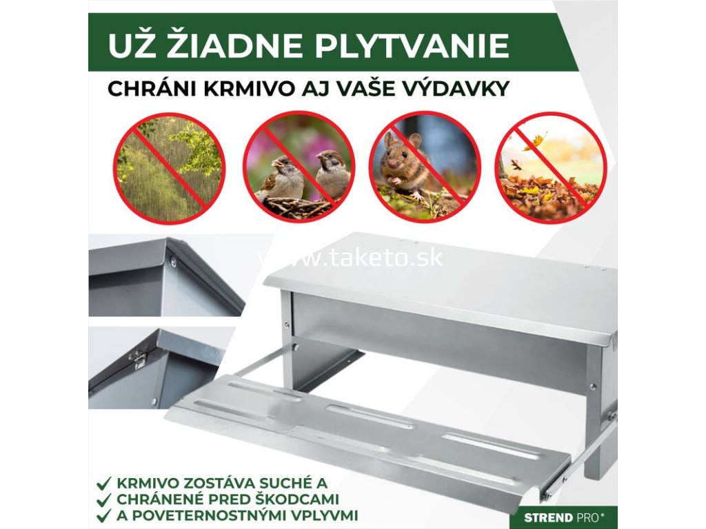 Automatické kŕmidlo Strend Pro je ideálnym pomocníkom preefektívne a čisté kŕmenie vašej hydiny.Jeho inovatívny mechanizmus umožňuje otvorenie nádoby s krmivom jednoduchým šliapnutím hydiny na nástupnú plošinku, čím sa minimalizuje plytvanie a zabraňuje znečisteniu krmiva.