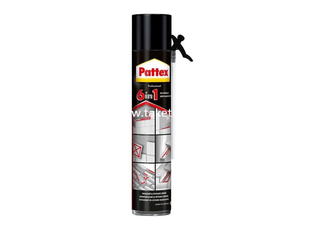 Pattex 6v1 je jednozložkové univerzálne trubičkové PU lepidlo vhodné pre rôzne druhy lepenia. Vyznačuje sa vynikajúcou priľnavosťou k rôznym povrchom v kombinácii s jednoduchou schopnosťou vyplnenia. Vďaka tomu je obzvlášť vhodné na nerovné povrchy. Použitie PU lepidla pomáha predchádzať vzniku tepelných mostov. Má vynikajúcu priľnavosť na väčšinu stavebných materiálov, ako je drevo, betón, kameň, kov atď. Plne vytvrdzuje do 2 hodín, kompletná mechanická pevnosť vzniká najskôr za 24 hodín. Účinnosť lepidla závisí od pracovných podmienok– teplota, vlhkosť vzduchu, podklad a aplikácia. Výrobok neobsahuje hnacie látky CFC.