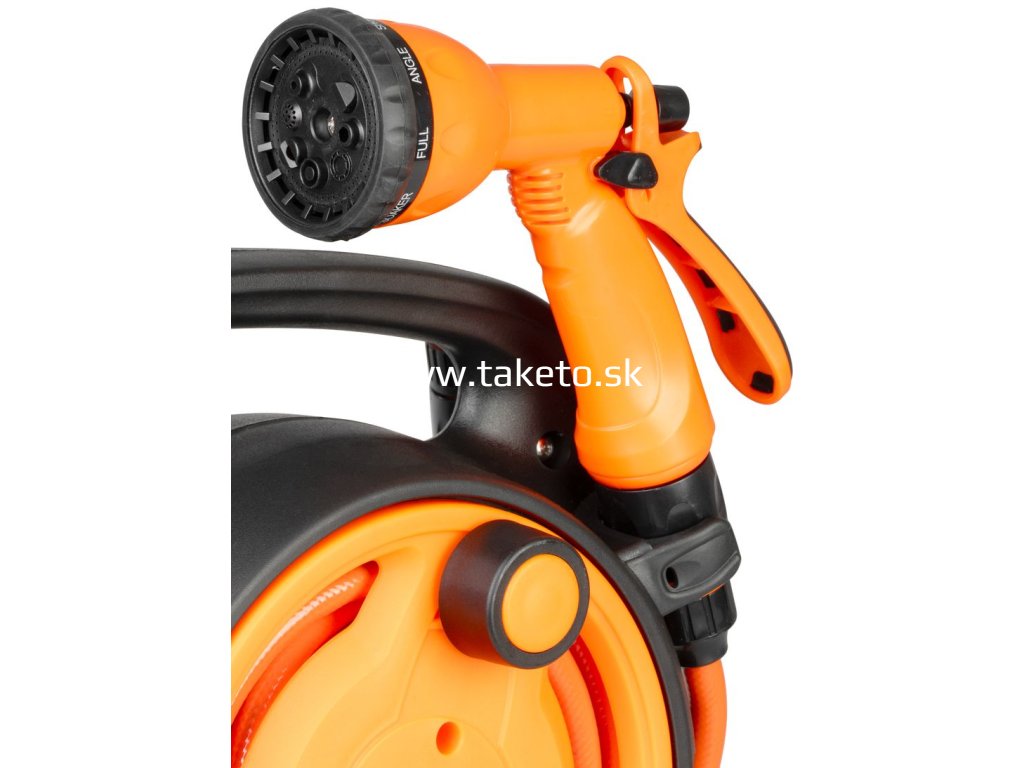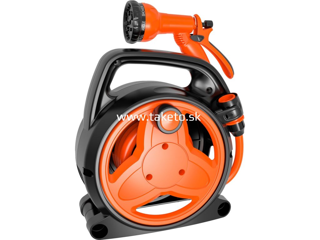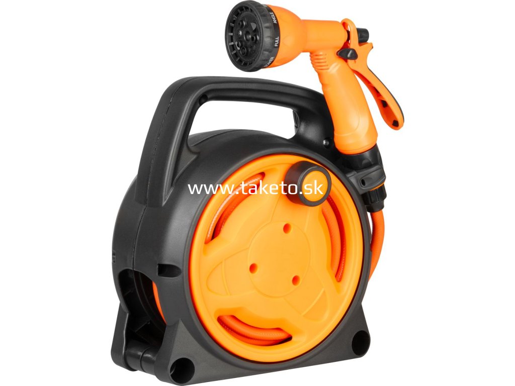 Strend Pro Gardenje praktickýnavijak s hadicouvybavený8-funkčnou zavlažovacou pištoľou, vhodný pre každodenné zavlažovanie záhrady, trávnika či kvetinových záhonov. Vďakakompaktnej konštrukcii s integrovanou rukoväťouje manipulácia veľmi pohodlná a ľahká.