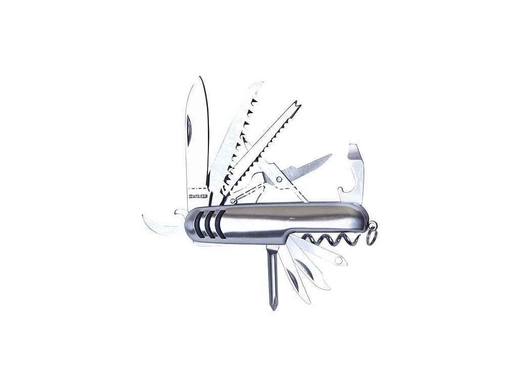 Multifunkčný nôž 15 v 1 poskytuje vykonanie 15 možných úkonov pomocou jediného praktického vreckového nožíka. Povrch noža, ako aj samotných nástrojov, je vyrobený z kvalitného materiálu, ktorý zabezpečuje dlhú životnosť. Nôž je možné použiť ako otvárač na konzervy, otvárač fliaš, vývrtky, nôž, pílku, plochý skrutkovač, nožnice, krížový skrutkovač, pilník, čistič nechtov, krúžok na kľúče, škrabku na rybie šupiny, čistič rybárskych háčikov, rydlo alebo navliekač nití.