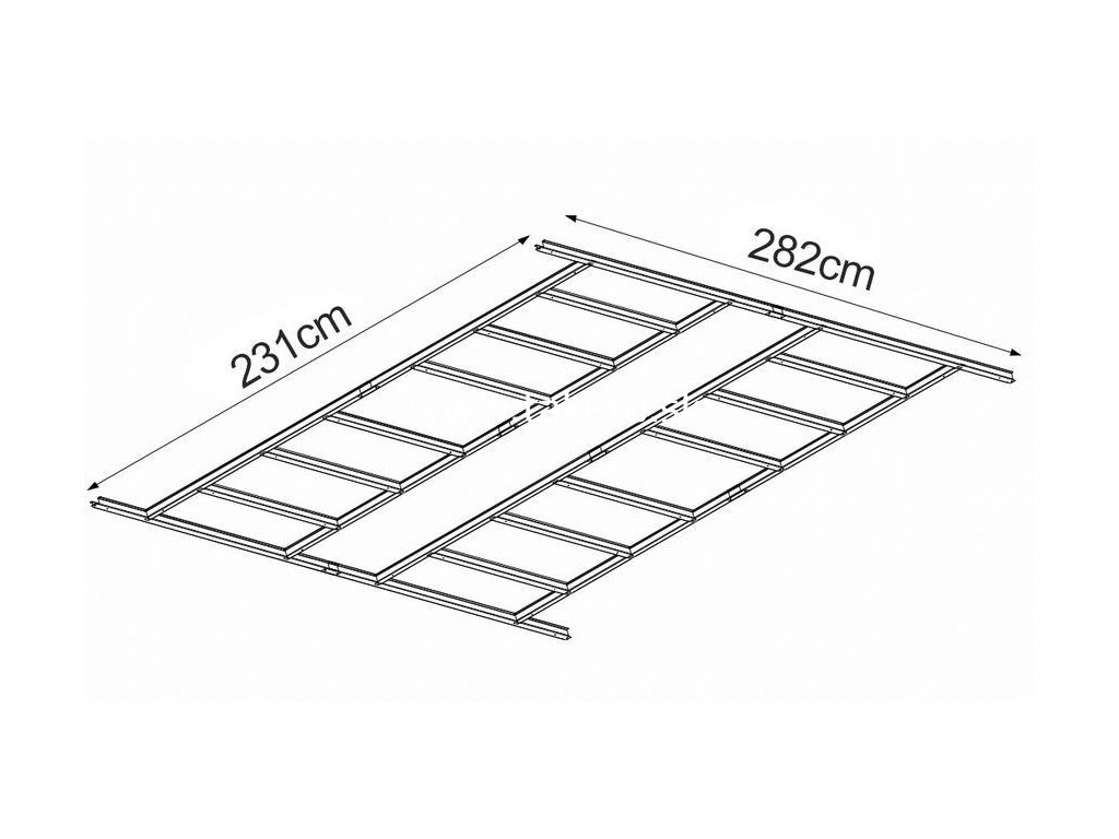 Podlahová konštrukcia vhodná pre záhradný domček. Slúži ako podklad pre podlahovú krytinu. Poskytuje stabilitu a pevnosť tak, aby domček stál rovnomerne a nehýbal sa. Vďaka podlahovej konštrukcii sa voda nedostane dovnútra a neznehodnotí podlahu ani vybavenie. Rozmery: 231x282 cm.