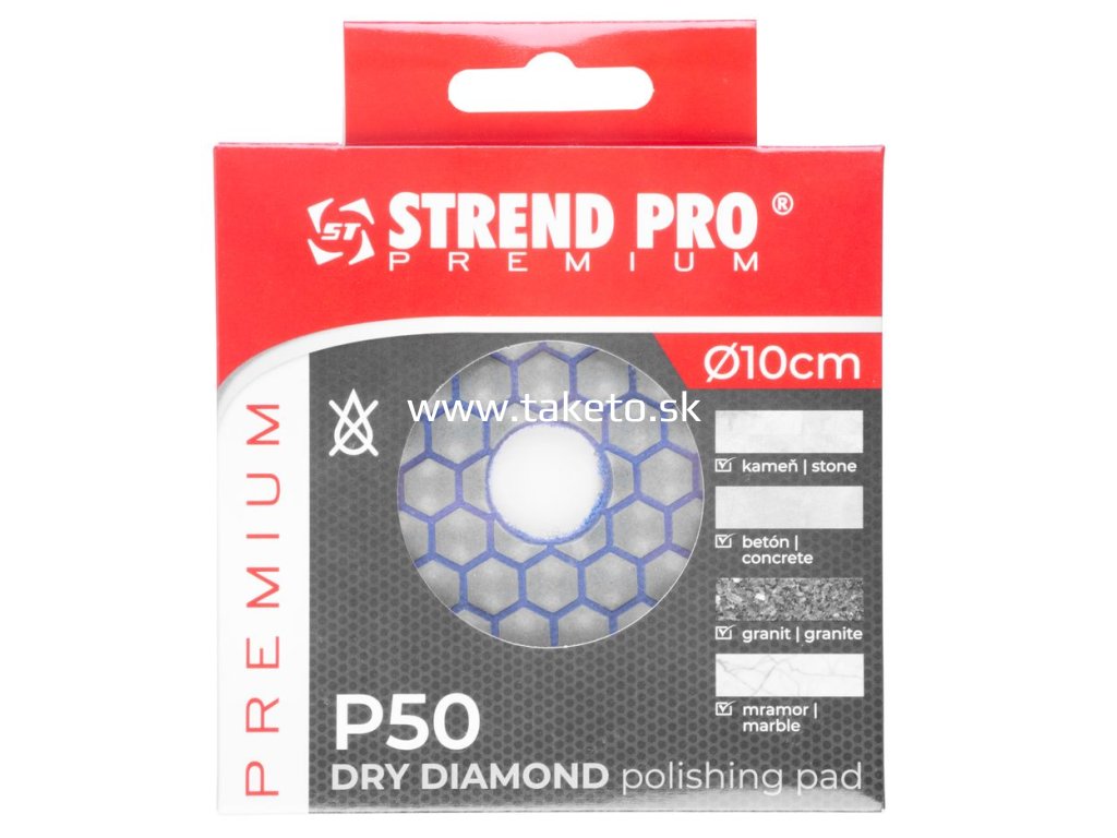 Diamantová, brúsna, leštiaca podložka Strend Pro by nemala chýbať vo výbave profesionálnych remeselníkov, ale aj domácich kutilov. Používa sa pre unášač so suchým zipsom. Slúži na leštenie prírodného kameňa, betónu, granitu a mramoru. Jej priemer je 10 cm a zrnitosť je P50.
