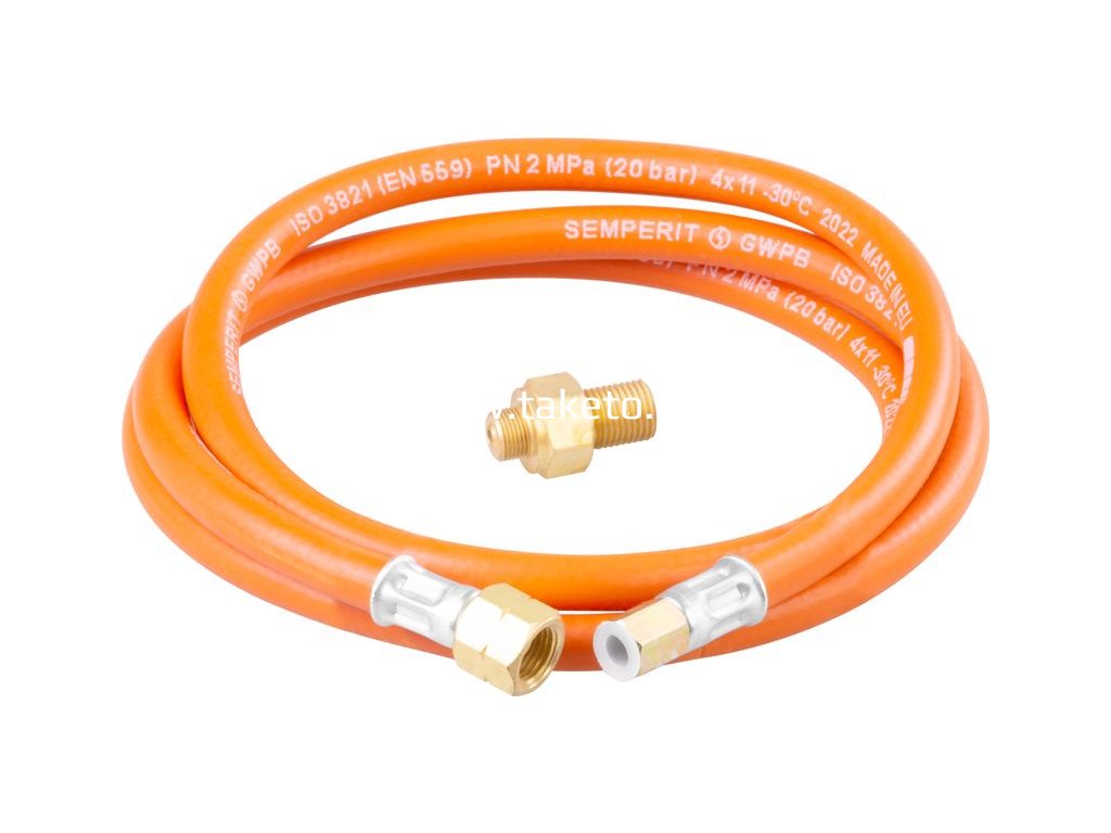 Pripojovací set s 1,5 m hadicou s koncovkami G1/4“L – M9 a redukcia 7/16“-G1/4L“, vhodné na prepojenie ohrievača Olymp a variča Dual Compact ku 2 kg propán-butanovej fľaši.