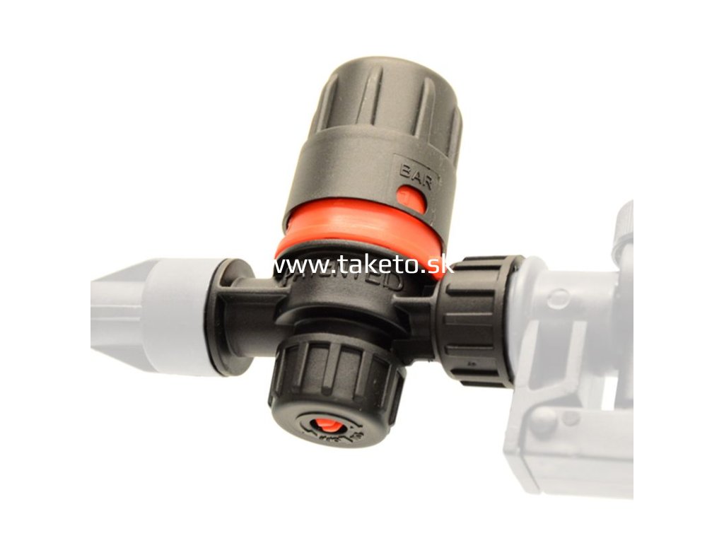 Regulátor ponúka 4 režimy nastavenia, ktoré sa ľahko ovládajú. Tlak môžete rýchlo zmeniť otáčaním horného gombíka, ktorý umožňuje voľbu medzi troma nastavenými tlakmi (1, 2 a 3 bar). Spodným prstencom (krúžkom) sa ovláda priamo funkcia zapnutia a vypnutia (on, off). Pre dlhú životnosť a spoľahlivú funkciu aj s chemickými prostriedkami sú použité tesnenia z materiálu NBR.