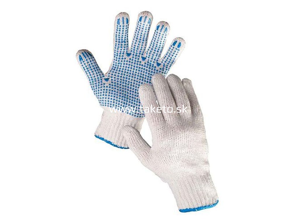 - bezšvový biely polyesterový úplet s pružným zápästím dlaň a prsty s modrými PVC terčíkmi. Veľkosť 09”.Dodatočné parametre