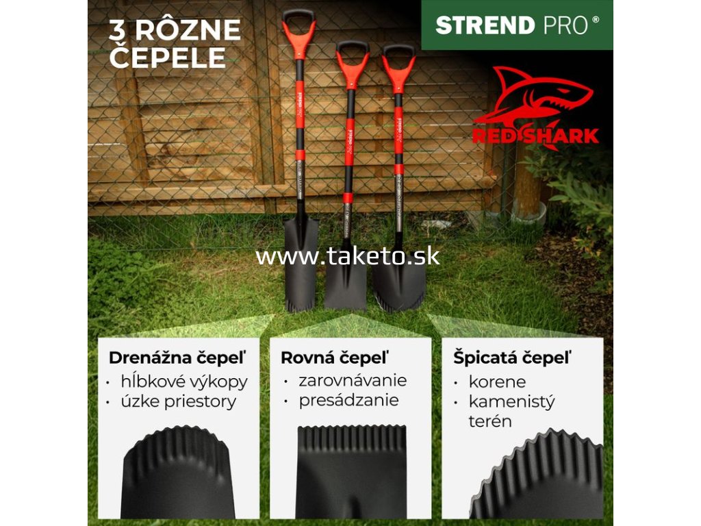 RýľStrend Pro Premium RedSharkvdrenážnom prevedenísručne ostrenými zubamina konci čepele je určený na presné a hĺbkové výkopové práce v úzkych priestoroch. Jeho úzka čepeľ je ideálna na kopanie rýh pre drenážne systémy, káble, trubky či výsadbu sadeníc.Predĺžená drevená násada typu Dsdĺžkou 1280 mmzabezpečuje pohodlné ovládanie, stabilitu a výborný dosah.