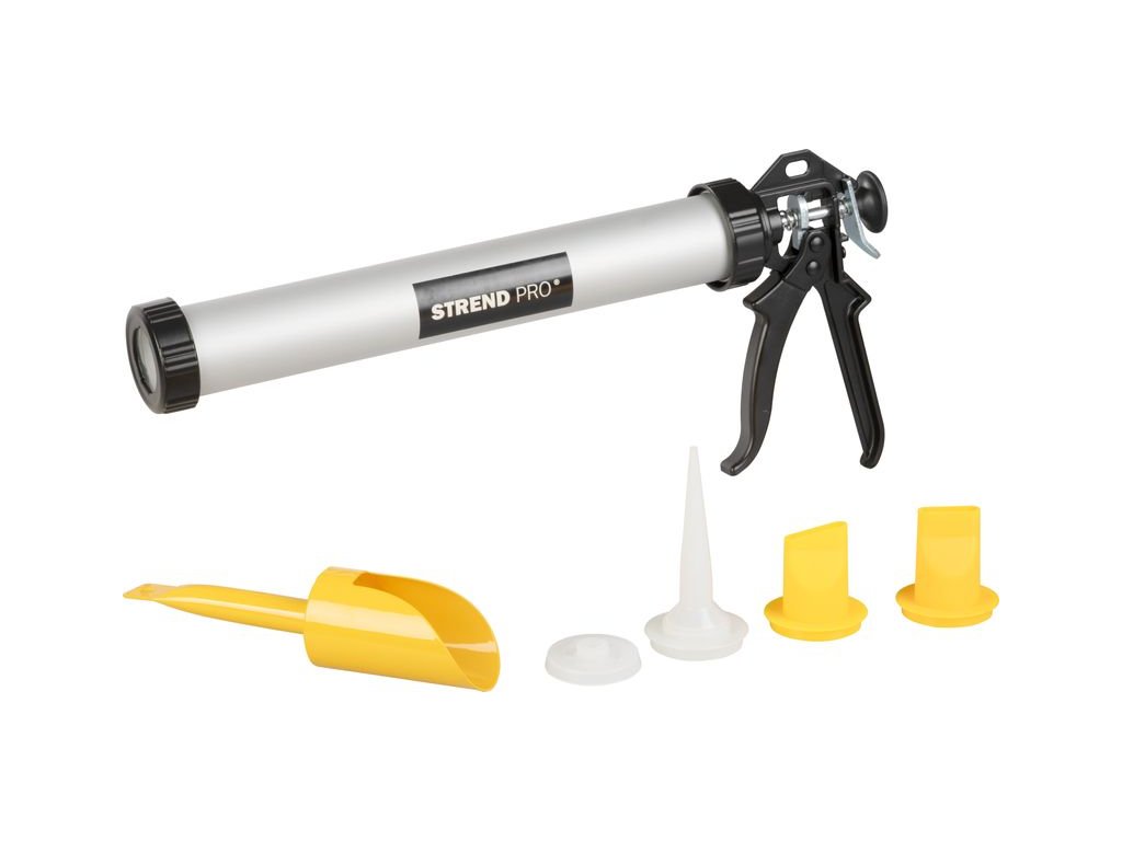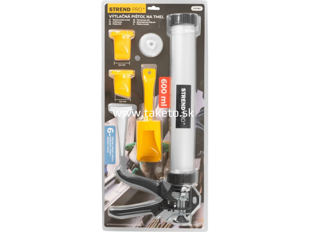Sada Strend Pro obsahuje profesionálnu výtlačnú pištoľ výtlačná s nadstavcami, ktoré umožňujú jednoduchú a presnú aplikáciu tmelov, silikónov či lepidiel. Pištoľ je určená pre 600 ml náplne a vďaka kvalitnému spracovaniu zaisťuje spoľahlivú a pohodlnú prácu aj pri dlhodobom používaní.