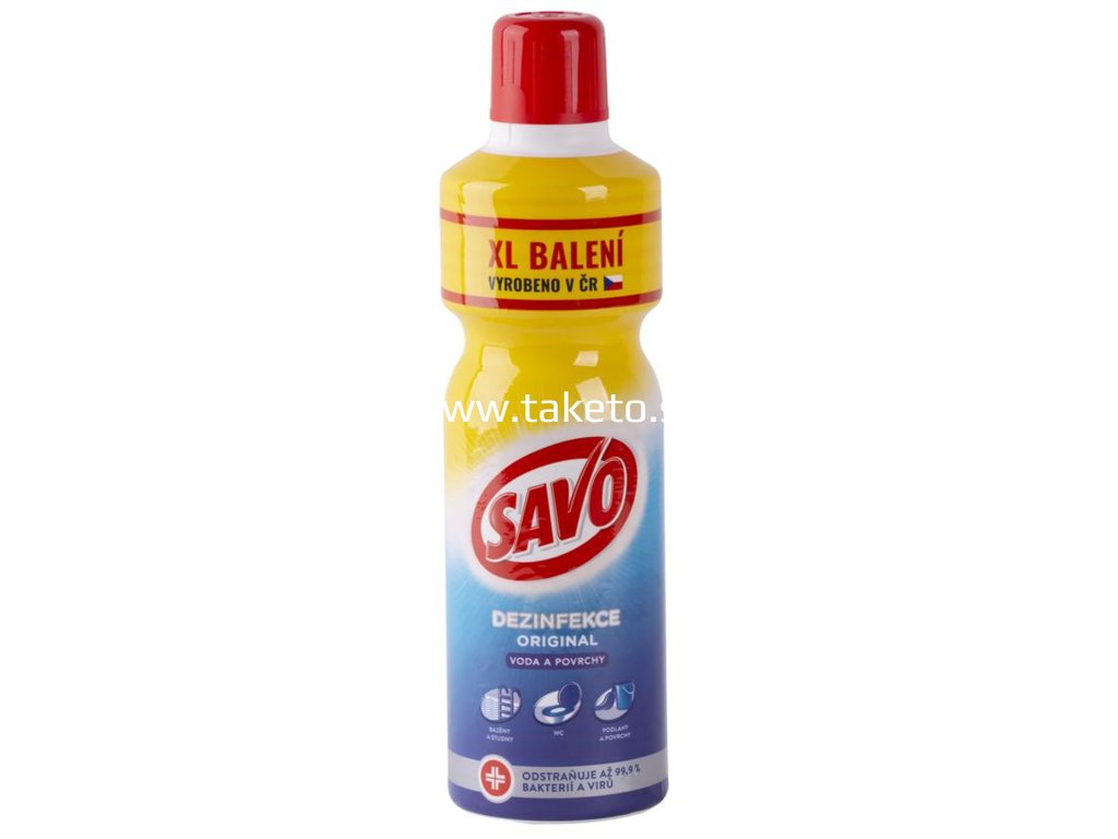 Pre zachovanie vášho domava v čistote - Spoľahlivo likviduje baktérie (vrátane Escherichia coli, Pseudomonas aeruginosa, Staphylococcus aureus), vírusy (vrátane HIV a HBV), riasy a mikroskopické huby. - vhodné na dezinfekciu dezinfekciu podláh, kuchynského a hygienického náradia, sanitárnej keramiky.Použitie:- Použite roztok z 1 l Sava Original a 9 l vody. - Doba pôsobenia 30 minút. - Silné znečistenie najskôr mechanicky odstráňte. - Hračky, predmety a plochy, ktoré prichádzajú do styku s potravinami, opláchnite po 30 min. pitnou vodou.Dezinfekcia pitnej vody v studniach:- Dávkujte 40 ml (1 uzáver) Sava Original na 2 m pitnej vody. - Dávku najskôr premiešajte v 9 l vody (napr. vo vedre) a potom kropte vodnú hladinu studne. - Po 30 min. je voda dezinfikovaná a súčasne dochádza k rozloženiu účinnej látky.Dezinfekcia vody v bazénoch:- Savo Original možno použiť ako celosezónny mikrobicídny a protiporastový prostriedok na prevádzku bazénov. - Kúpať sa je možné po 30 minútach od aplikácie prípravku.Iniciačná dávka:-Pre prvé zachlórovanie bazénu dávkujte 160 ml Savo Original na 3 m vody. -Dávku najskôr rozmiešajte v 9 l vody (napr. vo vedre) a potom po častiach vlejte do bazéna.Udržovacia dávka:- Na bežnú dezinfekciu a udržanie správnej koncentrácie voľného chlóru v bazéne dávkujte 80 ml Sava Original na 3 m vody každé 2 - 3 dni. - Pri dlhšietrvajúcich teplotách vzduchu nad 25 °C a trv alom slnečnom svite je vhodné aplikovať udržovaciu dávku denne.Šoková dávka:- Pri výskyte rias, dlhodobom horúcom počasí alebo zvýšenej prevádzke dávkujte jednorázovo 240 ml Sava Original na 3 m vody.