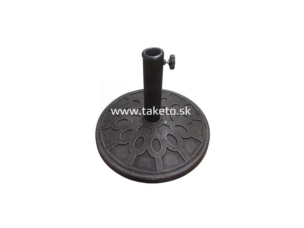 Stojan na plážový slnečník alebo dáždnik je vyrobený z pevného prírodného živicového materiálu. Spodná podstava vizuálne pripomína skôr kovový charakter, no oproti klasickému kovovému nie je tak ťažký. Navyše je celá spodná časť zvýraznená zaujímavým vzorom. Priemer tejto podstavy je 43 cm. Z podstavy vychádza stredová tyč, do ktorej sa napája slnečník. Výška tyče je 33 cm, čím poskytuje dostatočné prekrytie a spojenie častí slnečníka a stojanu. Maximálny priemer tyče požadovaného upevneného slnečníka je v rozmedzí od 38 do 52 mm. Po vložení slnečníka do tyče vychádzajúcej z podstavy je už len potrebné zaistiť ho prikrútením kolieska na boku. Hmotnosť stojanu je 9 kg.