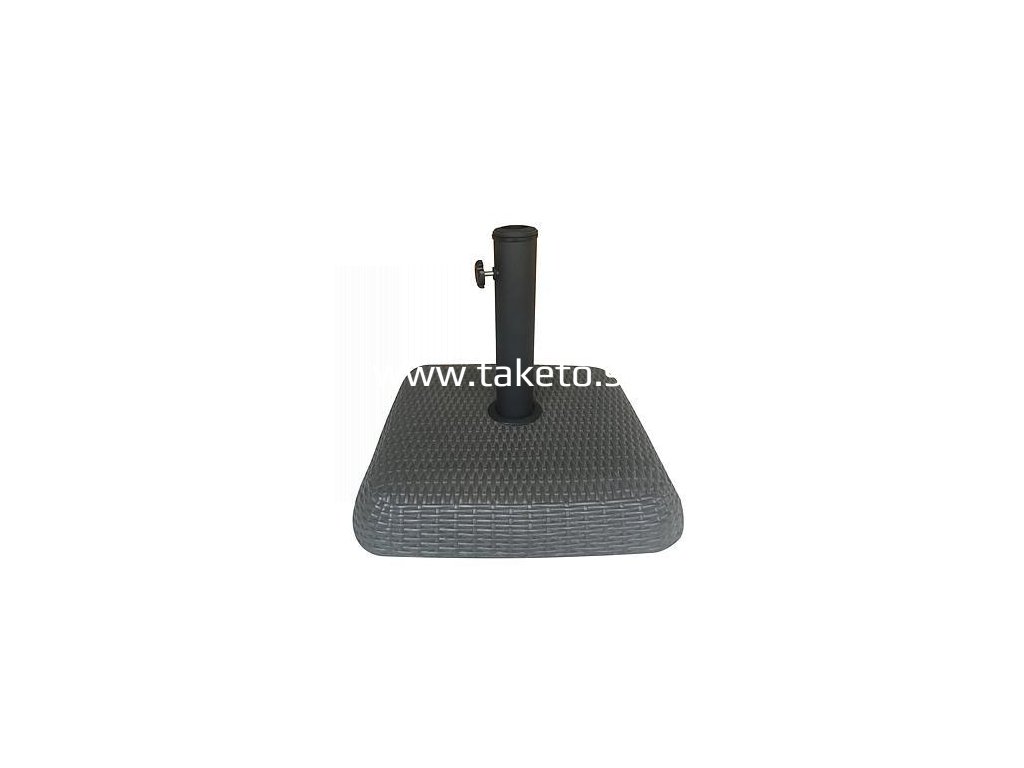 Stojan na dáždnik má štvorcovú podstavu a je vyrobený z betónu, čomu odpovedá aj jeho hmotnosť 29,7 kg. Výhodou takejto váhy je zabezpečená stabilita aj pre dáždniky s väčšími priemermi vrchných častí. Rovnako sa pri neprajných poveternostných podmienkach nemusíme báť o jeho prípadné odfúknutie či poškodenie. Zaujímavý je tiež dizajn, kedy sa celá betónová časť pokryla tmavohnedým pleteným poťahom. Priemer tejto podstavy je 46 cm a výška je 8 cm. Z podstavy vychádza tyč na ktorú sa následne napája dáždnik. Jednoducho ich do seba vsuniete a pomocou kolieska na boku ich zaistíte.