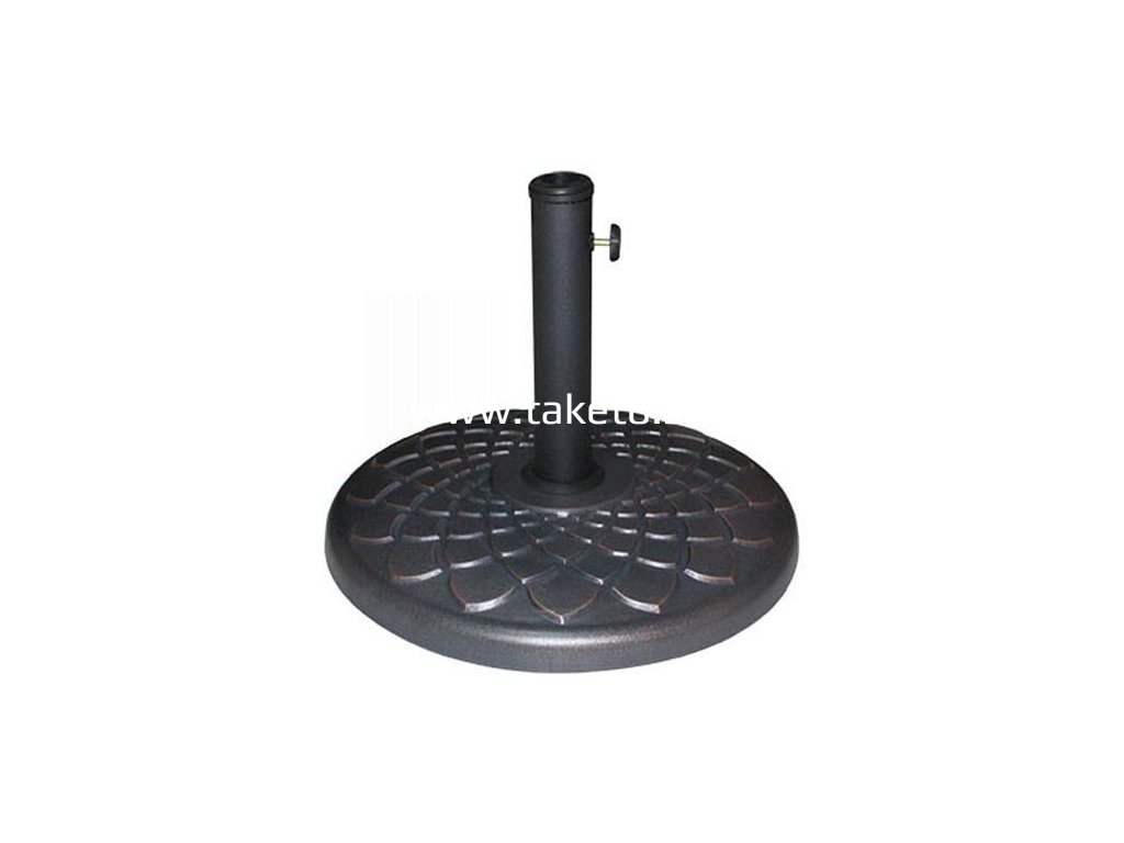 Stojan má kruhovú podstavu s priemerom 43 cm. Je vyrobený z trvácnej živice, čím sa nemusíte obávať o jeho životnosť. Vďaka svojej výraznej tmavej farbe a zaujímavej lupeňovej potlači bude nie len dekoratívny, ale tiež funkčný a praktický doplnok do každej záhrady. Slnečník sa napája do tyče vychádzajúcej zo stredu podstavy, dlhej 33 cm. Prekrytie častí stojanu a dážnika bude teda dostatočné nato, aby sa zabezpečila pevnosť celej konštrukcie. Priemer tyče dáždnika, ktorý sa nasadí do stojanu, môže byť maximálne 38 mm. Hmotnosť je až 25,66 kg, čo poskytuje bezpečný základ a stálosť.