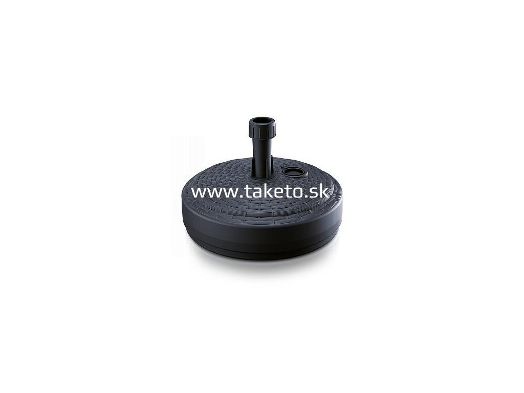 Stojan na slnečník je vyrobený z antracitového pevného plastu, ktorý je odolný voči atmosferickým vplyvom. Jeho hmotnosť je iba 681 g, čím sa stáva ideálnym kandidátom a pomocníkom aj na dovolenkách, keďže si ho viete zbaliť a priemiestniť kamkoľvek potrebujete. Spodná podstava je okrúhleho tvaru a jej veľkou výhodou je, že sa dá naplniť vodou alebo pieskom, čím sa dodrží potrebná váha pre bezpečné nasadenie slnečníka. Objem tejto spodnej časti je 10 l, čo je dostatočné pre vytvorenie potrebného závažia na spodnej časti stojanu. Rozmery sú 390 x 390 x 310 mm. Samotný slnečník sa pripevňuje veľmi jednoducho a to vsunutím a následným utiahnutím závitu na tyči nachádzajúcej sa v strede podstavy. Maximálny priemer tyče dáždnika, ktorý je možné upevniť, je 10 až 26 mm.