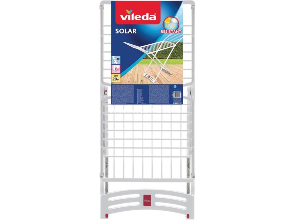 Rozkladací sušiak na bielizeň Vileda Solar je ideálny ako pre domáce, tak pre vonkajšie použitie. Vďaka konštrukcii zo 100% živice je veľmi odolný a stabilný, odolný voči hrdzi a vyniká dlhou životnosťou. 20 m sušiacej plochy vám zaistí dostatok miesta na vašu bielizeň.