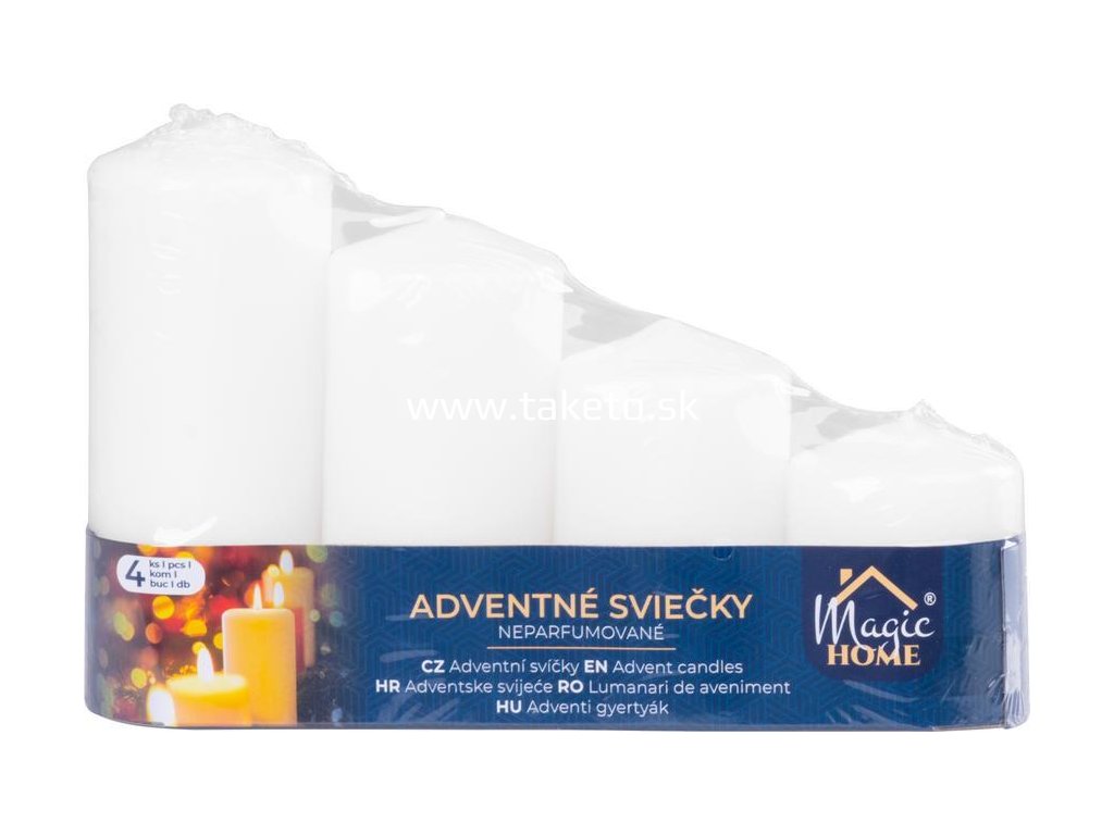 Adventné sviečky MagicHome skvele dotvoria čarovnú atmosféru Vianoc u Vás doma. Perfektne sa hodia na dotvorenie do advetných vencov či dekorácií. 4 rôzne výšky - 4,8x6 cm - váha vosku 85g, 4,8x8 cm - váha vosku 110 g, 4,8x10 cm - váha vosku 140 g, 4,8x12 cm - váha vosku 170 g. Farba: biela.