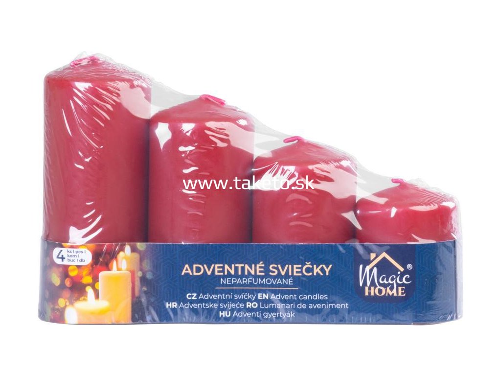 Adventné sviečky MagicHome skvele dotvoria čarovnú atmosféru Vianoc u Vás doma. Perfektne sa hodia na dotvorenie do advetných vencov či dekorácií. 4 rôzne výšky - 4,8x6 cm - váha vosku 85g, 4,8x8 cm - váha vosku 110 g, 4,8x10 cm - váha vosku 140 g, 4,8x12 cm - váha vosku 170 g. Farba: bordová.