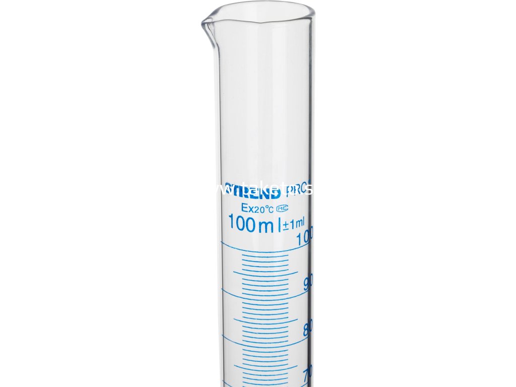 Odmerný sklenený valec slúži na meranie objemu kvapalín. Odmerka do 100 ml.