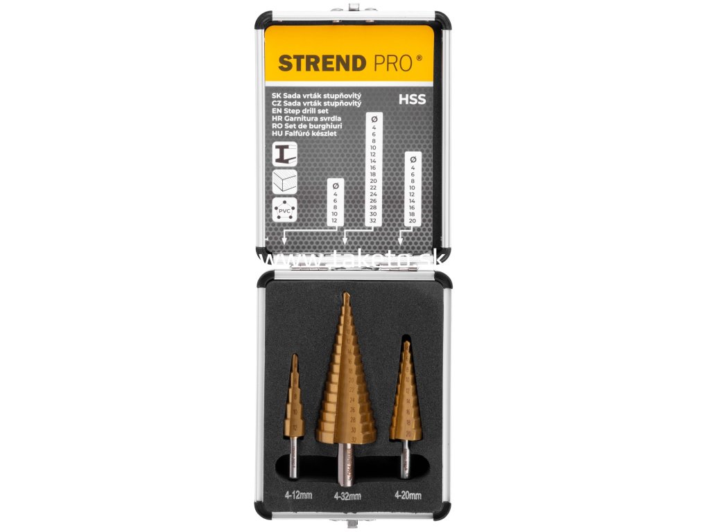 Sada troch stupňovitých vrtákov Strend Pro HSS s titánovou úpravou. Použitie: kov, drevo, plast. V praktickom hliníkovom kufríku nájdete vrtáky s rozmermi: 4-12 mm, 4-20 mm a 4-32 mm.