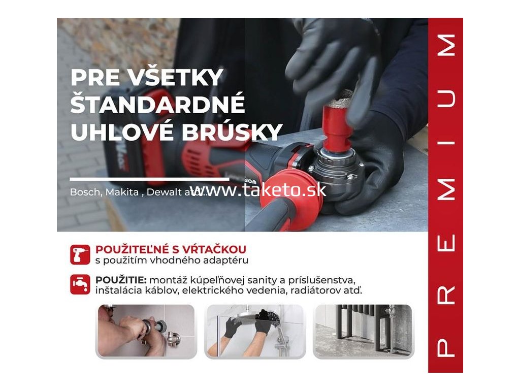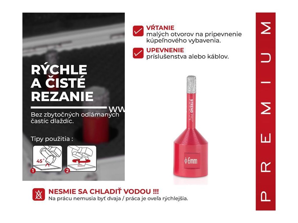 Vyrezávač Strend Pro Premium je vhodný na vyrezávanie všetkých druhov tvrdeného kameňa a jeho zlúčenín, keramických dlaždíc, mramoru, gresu, porcelánu a žuly. Špičkový proces spájania diamantov zabezpečuje vysokú odolnosť voči vysokým teplotám a predlžuje životnosť. Extrémne ľahké rezanie a vysoká výkonnosť pri vykružovaní. Jadro je plnené voskom, zabezpečuje chladenie, dlhšiu životnosť a lepšie rezanie. Perfektne ho využijete pri montáži kúpeľnovej sanity a príslušenstva, inštalácii káblov, elektrického vedenia, radiátorov atď. Je použiteľný s akoukoľvek vŕtačkou s použitím vhodného adaptéru. Typ upínania: M14, Ø vyrezávača je 6 mm.
