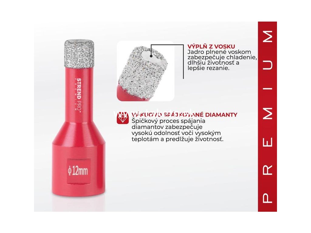 Vyrezávač Strend Pro Premium je vhodný na vyrezávanie všetkých druhov tvrdeného kameňa a jeho zlúčenín, keramických dlaždíc, mramoru, gresu, porcelánu a žuly. Špičkový proces spájania diamantov zabezpečuje vysokú odolnosť voči vysokým teplotám a predlžuje životnosť. Extrémne ľahké rezanie a vysoká výkonnosť pri vykružovaní. Jadro je plnené voskom, zabezpečuje chladenie, dlhšiu životnosť a lepšie rezanie. Perfektne ho využijete pri montáži kúpeľnovej sanity a príslušenstva, inštalácii káblov, elektrického vedenia, radiátorov atď. Je použiteľný s akoukoľvek vŕtačkou s použitím vhodného adaptéru. Typ upínania: M14, Ø vyrezávača je 12 mm..