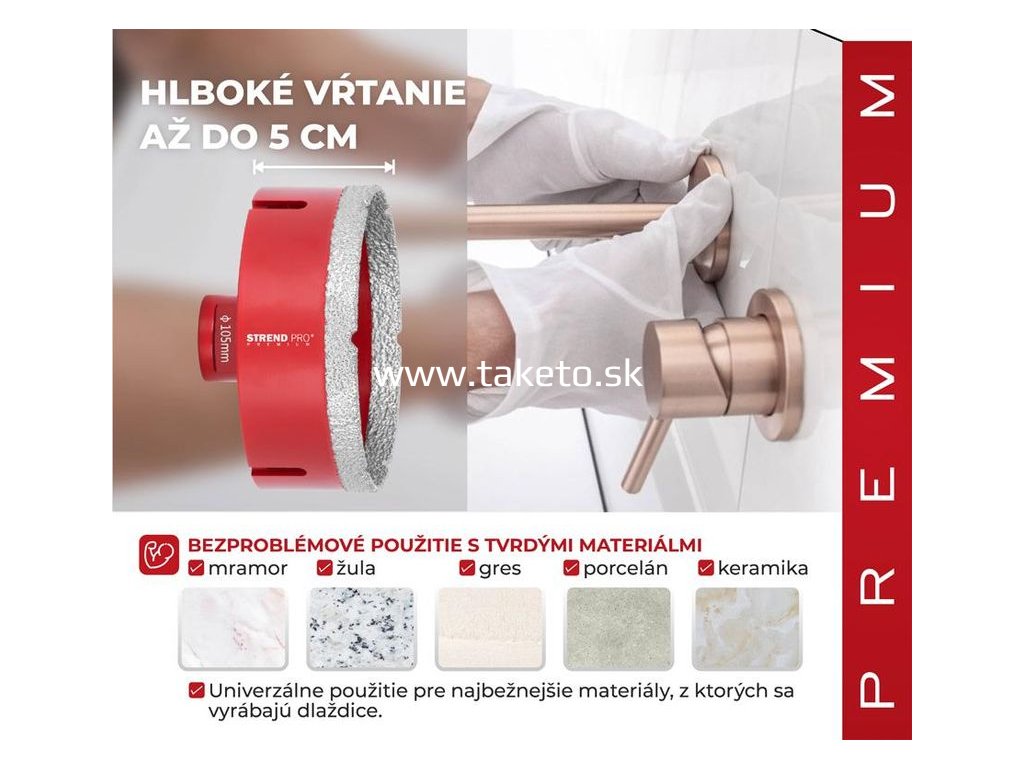 Vyrezávač Strend Pro Premium je vhodný na vyrezávanie všetkých druhov tvrdeného kameňa a jeho zlúčenín, keramických dlaždíc, mramoru, gresu, porcelánu a žuly. Špičkový proces spájania diamantov zabezpečuje vysokú odolnosť voči vysokým teplotám a predlžuje životnosť. Extrémne ľahké rezanie a vysoká výkonnosť pri vykružovaní. Perfektne ho využijete pri montáži kúpeľnovej sanity a príslušenstva, inštalácii káblov, elektrického vedenia, radiátorov atď. Je použiteľný s akoukoľvek vŕtačkou s použitím vhodného adaptéru. Typ upínania: M14, Ø vyrezávača je 105 mm.