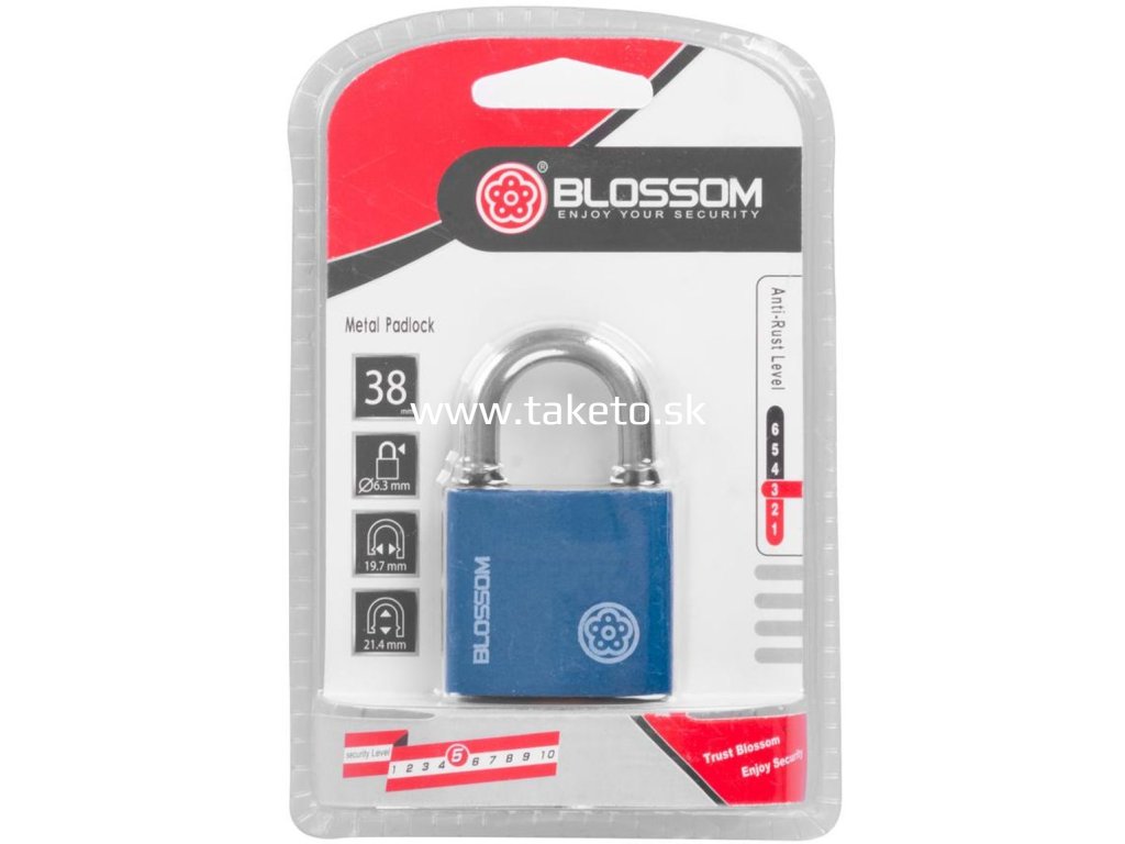 Zámok Blossom je určený na uzamykanie brán, dverí a skríň. Je to visiaci zámok so šírkou 38 mm a disponuje vlastnosťou Unique.