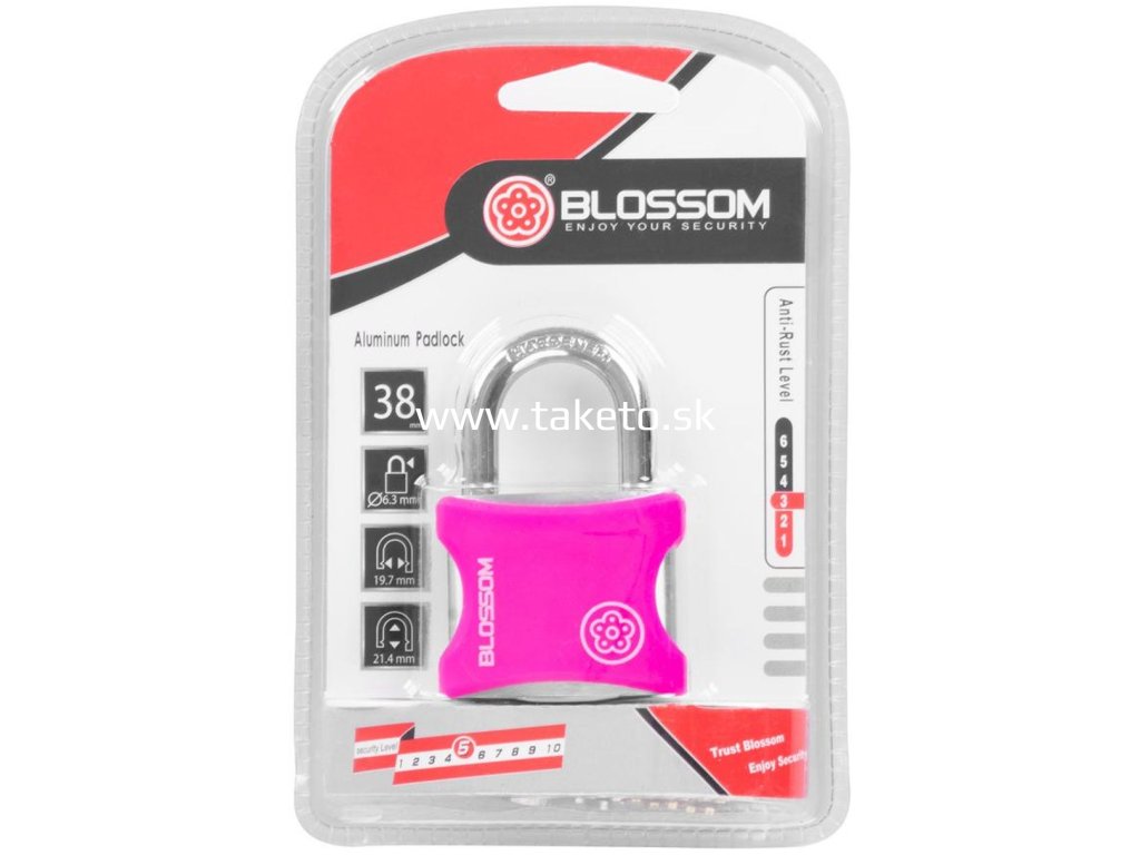 Zámok Blossom je určený na uzamykanie brán, dverí a skríň. Je to visiaci zámok so šírkou 38 mm. Súčasťou sú aj 3 náhradné kľúče.