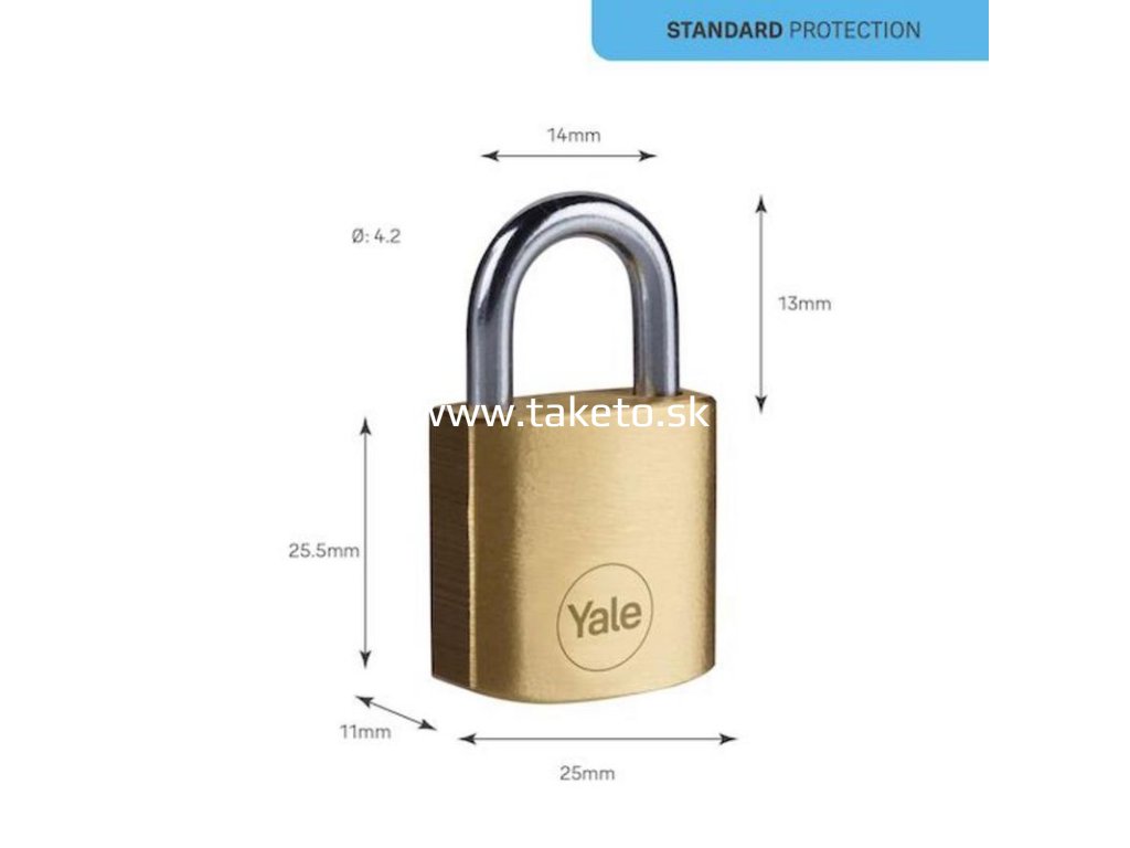 Visiaci mosadzný zámok Yale so šírkou 25 mm so štandardným stupňom zabezpečenia. Testovaný na odolnosť proti korózii až 96 hodín, aby poskytovali ochranu proti rôznym poveternostným podmienkam. Balenie obsahuje 3 kľúče.
