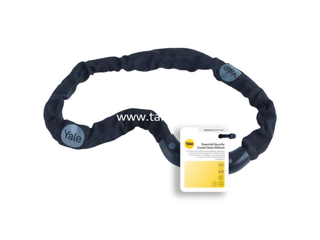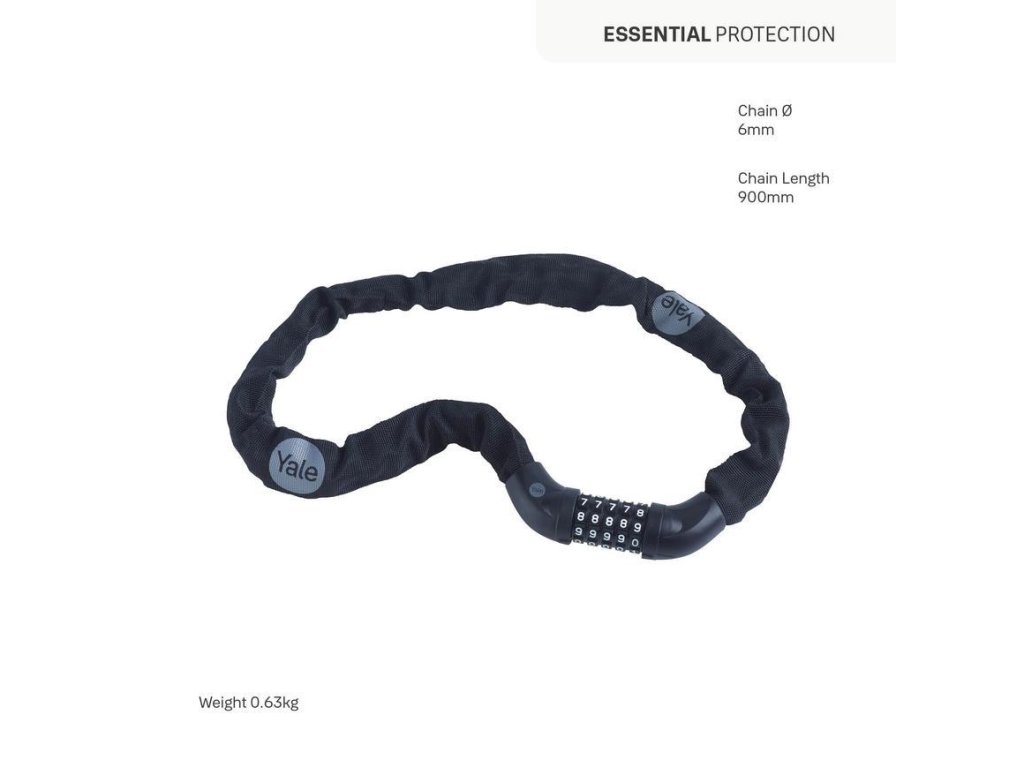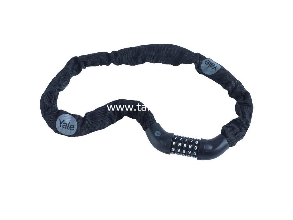Reťazový zámok na bicykel Yale na kód. Reťaz vyrobená z uhlíkovej ocele. Odolný voči poveternostným vplyvom. Hrúbka reťaze: 6 mm. Dĺžka oceľovej reťaze: 90 cm.