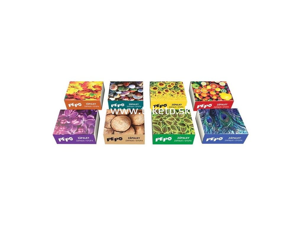 PE-PO zápalky v 8 rôznych krabičkách, 55mm, v balení 100 ks.
