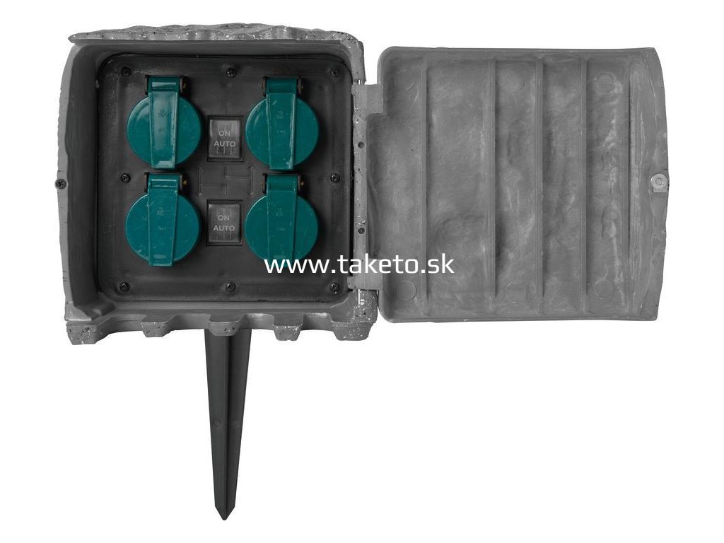 Záhradná zásuvka Strend Pro v imitácii kameňa je ideálna do záhrady alebo na terasu. Disponuje funkciou súmrakového senzoru - za súmraku zapne po 2 zásuvky a za svetla ich opäť vypne. Možnosť pripojiť 4 zariadenie do zásuviek so samozatváracím sklopným krytom. Zásuvku možno upevniť na trávnaté plochy, pevnú zem, drevené terasy, kamenné platne atď. Balenie obsahuje upevňovací kolík a materiál na upevnenie. Dĺžka prípojného káblu je 3 metre. Trieda ochrany: IP44. Maximálna záťaž: 16 A. Priemer vodiča: 1,5 mm2.
